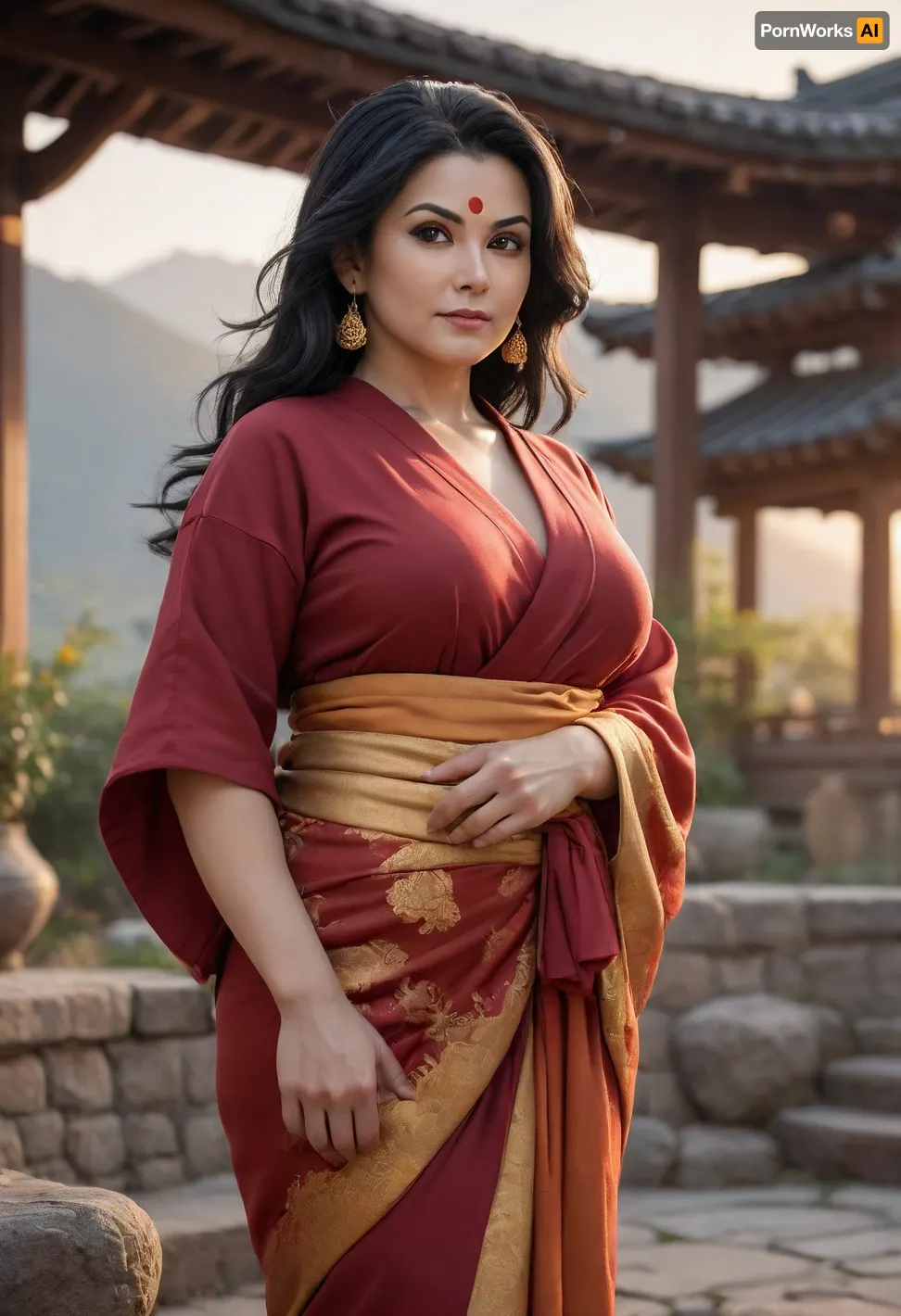 Dragon Ball character Chi-Chi, re-imagined as a Indian gilf, 60+ slut, old strong mature milf, old graceful woman in her 50s, milf woman, chubby, big tits, busty figure, horny, seductive pose, standing in the courtyard of her mountain home at sunset. Her long black hair flows in the wind, and she wears a deep red kimono with gold accents. Her eyes are calm but intense, carrying years of strength and wisdom. Warm orange sunlight highlights her face, soft mist drifts around the mountains behind her. Cinematic lighting, painterly anime realism, ultra-detailed textures, emotional atmosphere, high-resolution 4K illustration.