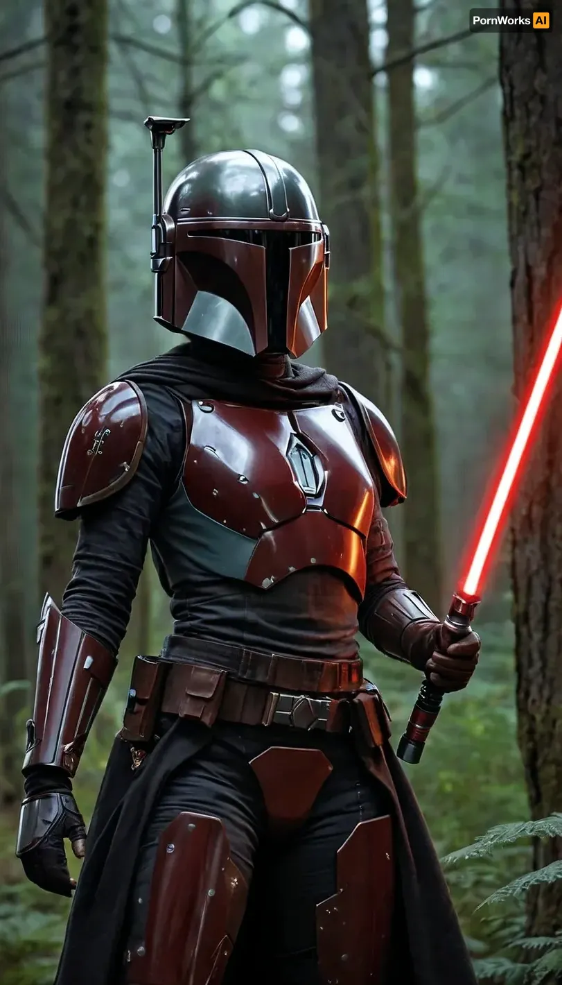 A female mandalorian, sleek revealing black armor with red details, bare skin, forest planet with space ship in the back round, wielding a red lightsaber, fantasy, highly detailed, digital painting, artstation, sharp focus, fantasy art, illustration, 8k, in the style of greg rutkowski. It's an absolute world-class masterpiece artwork. It's an aesthetically pleasing artwork with impeccable attention to detail and impressive composition.