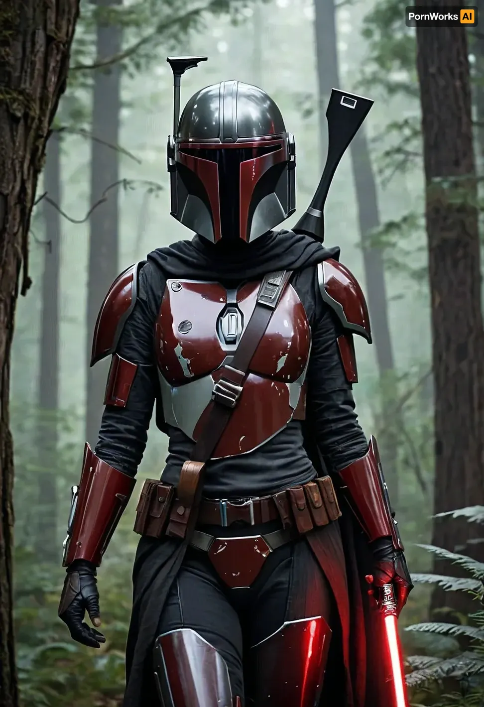 A female mandalorian, sleek revealing black armor with red details, bare skin, forest planet with space ship in the back round, wielding a red lightsaber, fantasy, highly detailed, digital painting, artstation, sharp focus, fantasy art, illustration, 8k, in the style of greg rutkowski. It's an absolute world-class masterpiece artwork. It's an aesthetically pleasing artwork with impeccable attention to detail and impressive composition. A female mandalorian, sleek revealing black armor with red details, bare skin, forest planet with space ship in the back round, wielding a red lightsaber, fantasy, highly detailed, digital painting, artstation, sharp focus, fantasy art, illustration, 8k, in the style of greg rutkowski. It's an absolute world-class masterpiece artwork. It's an aesthetically pleasing artwork with impeccable attention to detail and impressive composition.