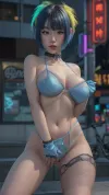 512x768, look, at, my, prompts, <lora:SDXL_Sevenof9_7th_NSFW:1> A full body photo of a stunning, confident 20-year-old Japanese woman with an elegant yet bold appearance, posed against the backdrop of a futuristic city at dusk. She has luxurious, blue and platin yellow short hair with a side-shaved cut, exuding sophistication and charisma. Dressed in a fitted, completely fully transparent, her big breasts and nipples are in full view, as well as her hairy poyccy very tiny leotard with subtle fishnet details, her outfit includes matching fishnet gloves and a choker that glow gently under neon lights. blue colored nail art details on finger and toe nails. Her expression radiates self-assurance as she strikes a poised, arching-back pose, highlighting her strength and presence. The warm summer ambiance enhances the vibrant cityscape, with neon accents adding depth and allure to the scene. High-resolution, realistic photo with detailed lighting and textures, Ancient costume beauties, Hanfu beauties, Smoke painting