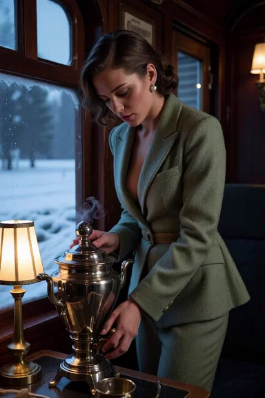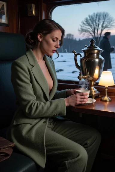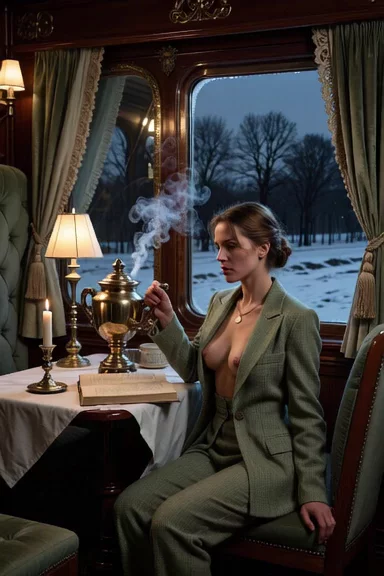 "Girl on the Orient Express" February 1934. The Orient Express cuts through a frozen landscape — vast snow-covered plains, bare black trees, a leaden sky at dusk. Inside the wagon-restaurant, a woman in her early thirties sits alone at a table set for one. She's undressing a sage-green wool travel suit, and wears small hat with a dark veil pushed back, pearl earrings. Beside her, an open novel face-down on the white tablecloth. She is not reading. A brass samovar sits at the center of the table, steam rising slowly in the lamplight., (She's taking off her travel suit, showing her nipples:1.5), . Slow push-in toward her face. Her expression is unreadable — composed, perhaps too composed. Outside the frosted window, nothing but white. Close-up, her face. Style, the visual atmosphere of early BBC Agatha Christie adaptations — muted greens and creams, heavy fabrics, the particular stillness of enclosed spaces in winter. Grain, softness, no sharp edges. Mood, a woman who knows something. Or suspects something. Or is herself the thing to be suspected.