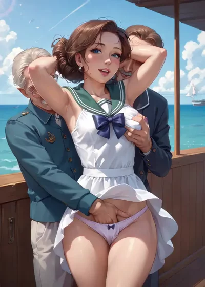 एआई ने जटिल फीता विस्तार के साथ नीलमणि नीली रेशम पोशाक में एक सुंदर यूरोपीय नोबल महिला की छवि बनाई। वह एक नौसेना पोत के डेक पर खड़ा है, उसकी अभिव्यक्तिपूर्ण हरी आंखें चाँद के नीचे समुद्र की चमक को दर्शाती हैं। कप्तान, अपने नौसेना वर्दी में, उसे सम्मान और घुसपैठ के मिश्रण के साथ दृष्टिकोण देता है, उसका मजबूत हाथ धीरे उसे केबिन की ओर मार्गदर्शन करता है। वातावरण परिष्कृत लालित्य में से एक है, जो तेल चित्रों और फारसी आसनों से भरा है, जिससे पूर्व-राफेलाइट पेंटिंग की एक सेटिंग याद आती है। उसके सुरुचिपूर्ण बालों ने अपनी पीठ को बंद कर दिया क्योंकि वह पूरी तरह से अपनी पोशाक को समायोजित करती है, जिसके तहत एक आदर्श आंकड़ा प्रकट होता है।.