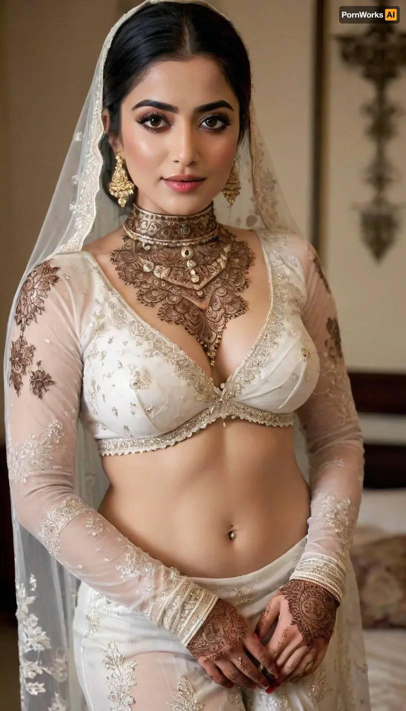 एआई उत्पन्न छवि पारंपरिक पोशाक में सजाए गए एक आश्चर्यजनक पाकिस्तानी देसी दुल्हन को दर्शाता है। वह एक सफेद पारदर्शी हिजाब पहनती है जो उसके सुंदर चेहरे और लंबे काले बालों को फ्रेम करती है। उनका जीवंत मेहंदी डिजाइन उनके हेना के जटिल पैटर्न के खिलाफ खड़ा है, इन परंपराओं के सांस्कृतिक महत्व को दर्शाता है।.