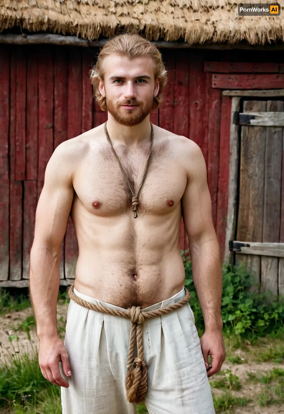 documentary style, authentic historical reconstruction, full-body portrait of an ordinary Slavic man, (27 years old), in medieval Rus. blonde hair. Average, soft physique with no muscle definition, naturally very hairy chest and stomach. He wears a simple linen undershirt, (rubakha), untied and open over his hairy body, and plain medieval trousers, (portki), tied with a rope. The pants are slightly lowered, revealing a hairy pubic area. He stands in a village setting near a wooden shed. There's another man standing nearby, he's red-haired, he's 30 years old. He has thick chest hair and hairy armpits. He puts his arm around the first man's shoulders, smiling. Earth tones, natural daylight, unposed, skin with imperfections, dirty hands and feet in simple footwear, handslora, <lora:sweaty_shirt_v5-28-B1-Rescale:.8>, <lora:Hands:.8>, <lora:Puppy_Face:.8>, <lora:Inata_Hot_Guys:.8>