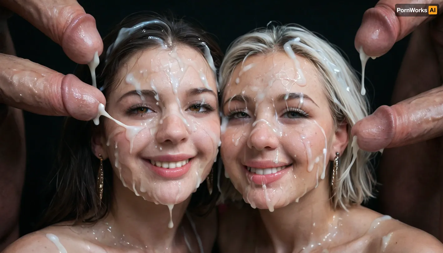 2 white mature curvy women, smiling, eyes open, (Cum details), realistic cum, Prominent cum, (white cum:1.7), cum on, (Cum flows:1.2), (cum on body:1.3), cum on head, (cum on face:1.3), bukkake, ((body covered with semen)), black room, black background, cum, face, Face covered in cum, (A lot of cum:1.5), 3+men, surrounded by dicks, <lora:JustCum:.7>, <lora:cum_in_eye_deepmind:.8> 2 white mature curvy women, smiling, eyes open, (Cum details), realistic cum, Prominent cum, (white cum:1.7), cum on, (Cum flows:1.2), (cum on body:1.3), cum on head, (cum on face:1.3), bukkake, ((body covered with semen)), black room, black background, cum, face, Face covered in cum, (A lot of cum:1.5), 3+men, surrounded by dicks, <lora:JustCum:.7>, <lora:cum_in_eye_deepmind:.8>