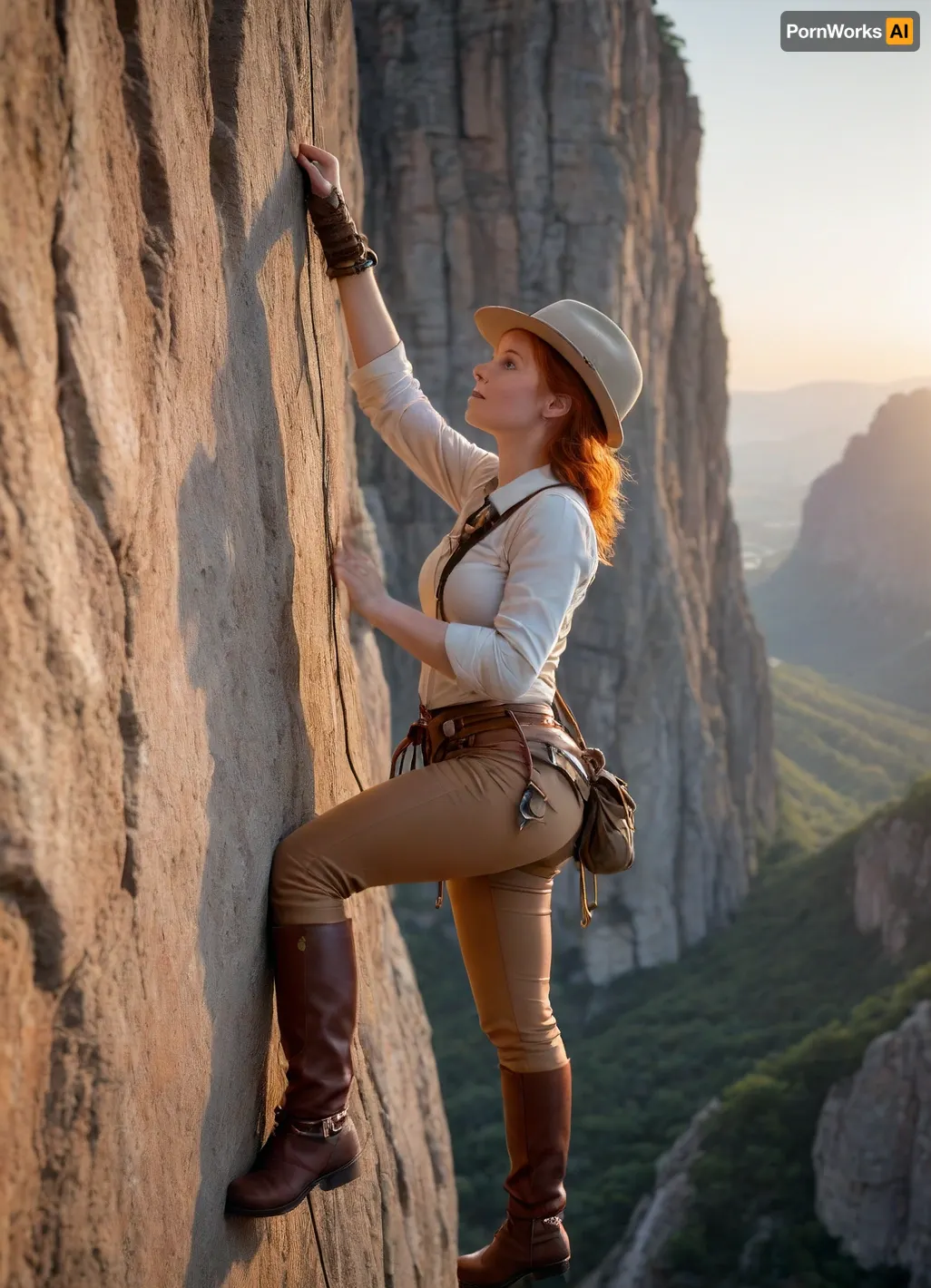 Seen from the side, a woman is abseiling, (alpinism harness attached to a rope hanging from the edge of the cliff), a steep cliff, (covered by prious gems), reaching out to grab a sparkling stone, (diamond, shiny, big), attached to the rock face. She, a young, (red head, big breast, big ass, slightly smiling), geologist is wearing an adventurer, (safari, fedora hat, beige, brown leather boots), outfit. Shot during sunset, the shadows create an intense and dramatic atmosphere. The sky is transitioning from blue at zenith to majestic orange and pink at the horizon Solo 1girl, Masterpiece, realism, intricate details, 8K, low angle.