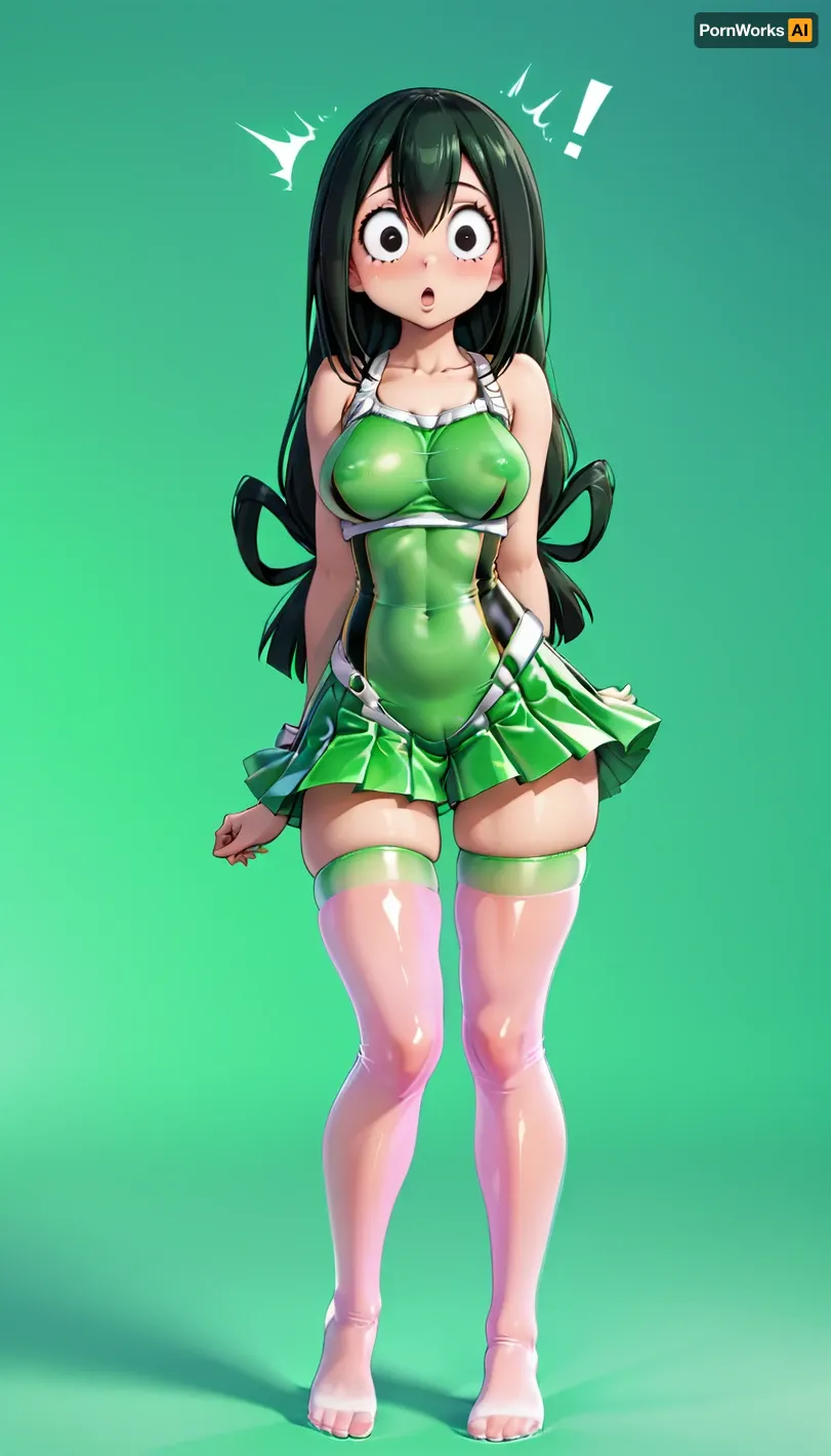 Tsuyu Asui, big boobs, tight top, pleated skir, transparent legwear, surprised look