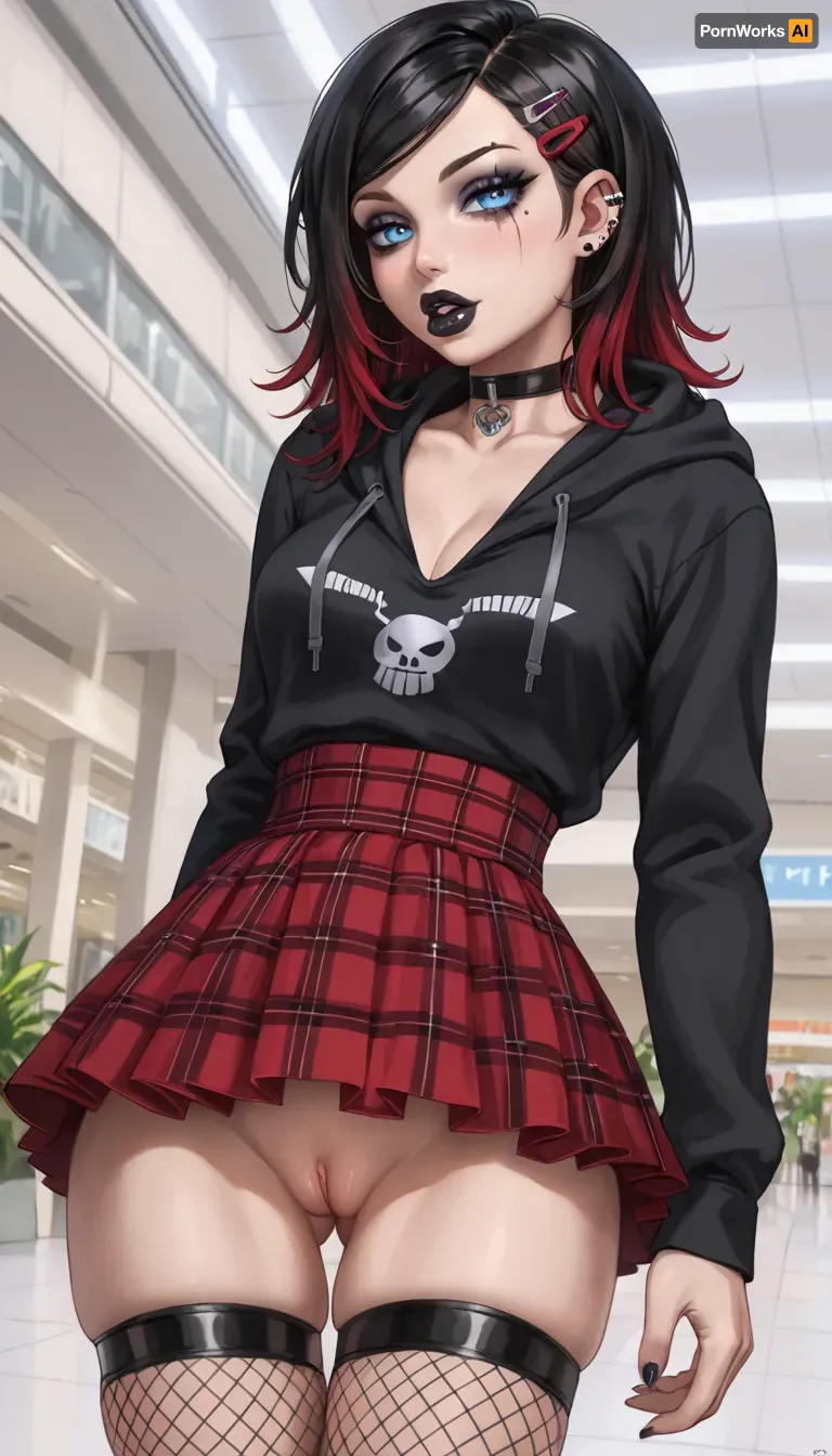 Tight asshole, pervy cute frisky emo girl, covered in tattoos, lots of tattoos, extremely horny, very attractive slutty hottie giving viewer peek of her tiny incredibly tight pussy, (huge anal plug:1), looking back at viewer with adorable extreme lewdness, beautiful face like a supermodel, glamorous goth makeup, black lipstick, (full thick lips:1.1), beautiful, gorgeous, perfect adorable face, small cute nose, (blue perfect eyes), (large seductive eyes:1.3), (incredibly sexy physique:1.4), narrow shoulders and chest, narrow waist, perfect round ass, thigh gap, naturally busty, long straight black hair with highlights, (hair clip:1.4), (black hoodie:1.3), (red plaid skirt), (fishnet stockings), (showing pussy:1.2), mall, TattooVariations, 3m0, Punk, G1rl, portrait, makeup, glowing, punk, 1girl, emo, girl, <lora:lora-sdxl-perfect-eyes:2>, <lora:TattooVariations:1.9>, <lora:Emo_Punk_Girl:1.2>, <lora:2010s_Emo_Style_XL:.6>