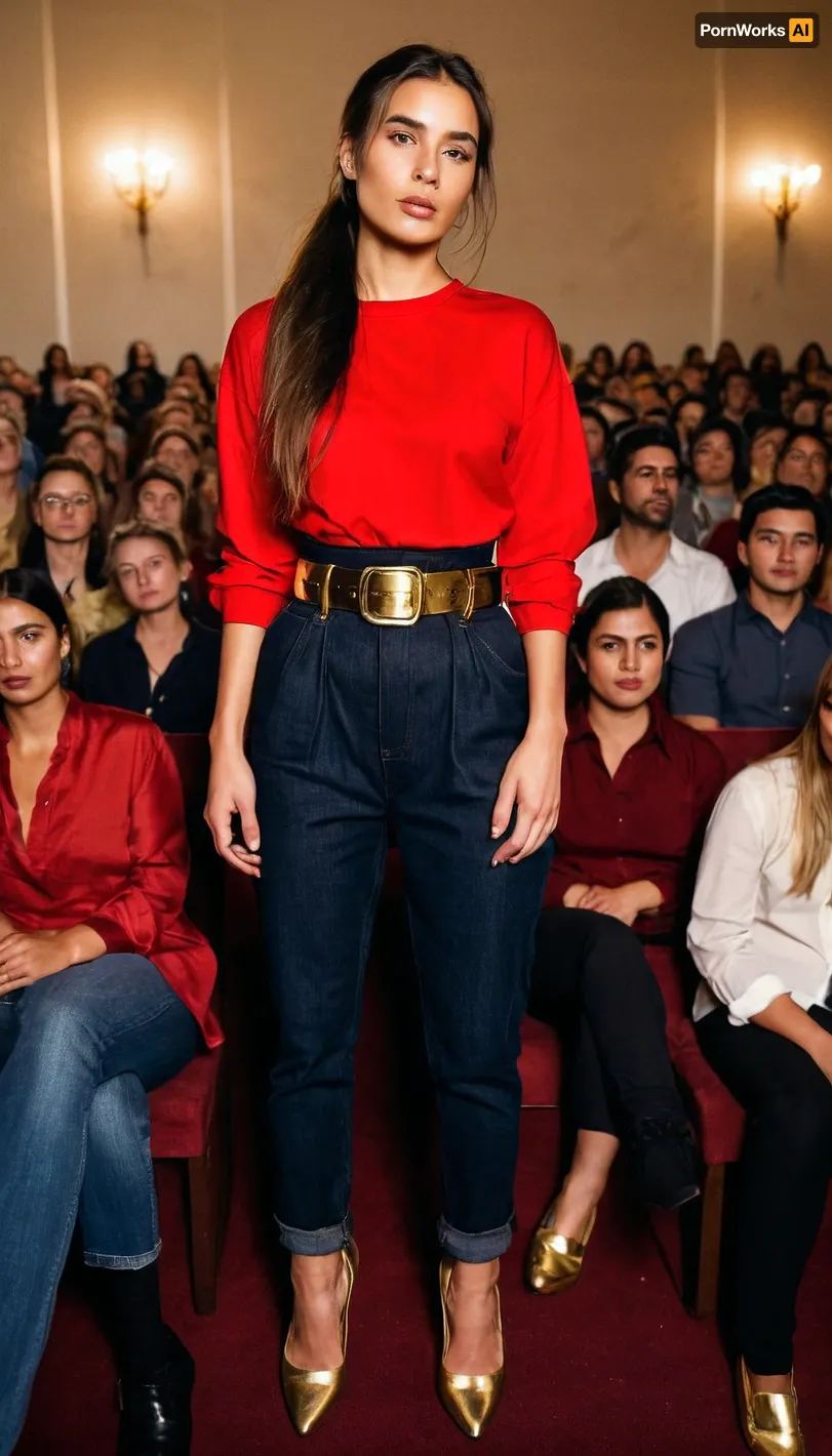 dark black baggy paperbag slouchy jeans, very long hair, gold belt, gold shoes, miss ceremony, slouchy style, ponytail, red blouse, audience