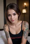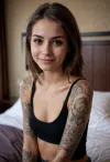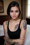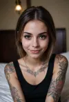 (medium shot), portrait of a cute beautiful sexy tattooed 18 years old girl, skinny, dark eyes, mysterious, (naughty look:1.2), (malicious smile), dirty mood, simple black top, hotel room (medium shot), portrait of a cute beautiful sexy tattooed 18 years old girl, skinny, dark eyes, mysterious, (naughty look:1.2), (malicious smile), dirty mood, simple black top, hotel room