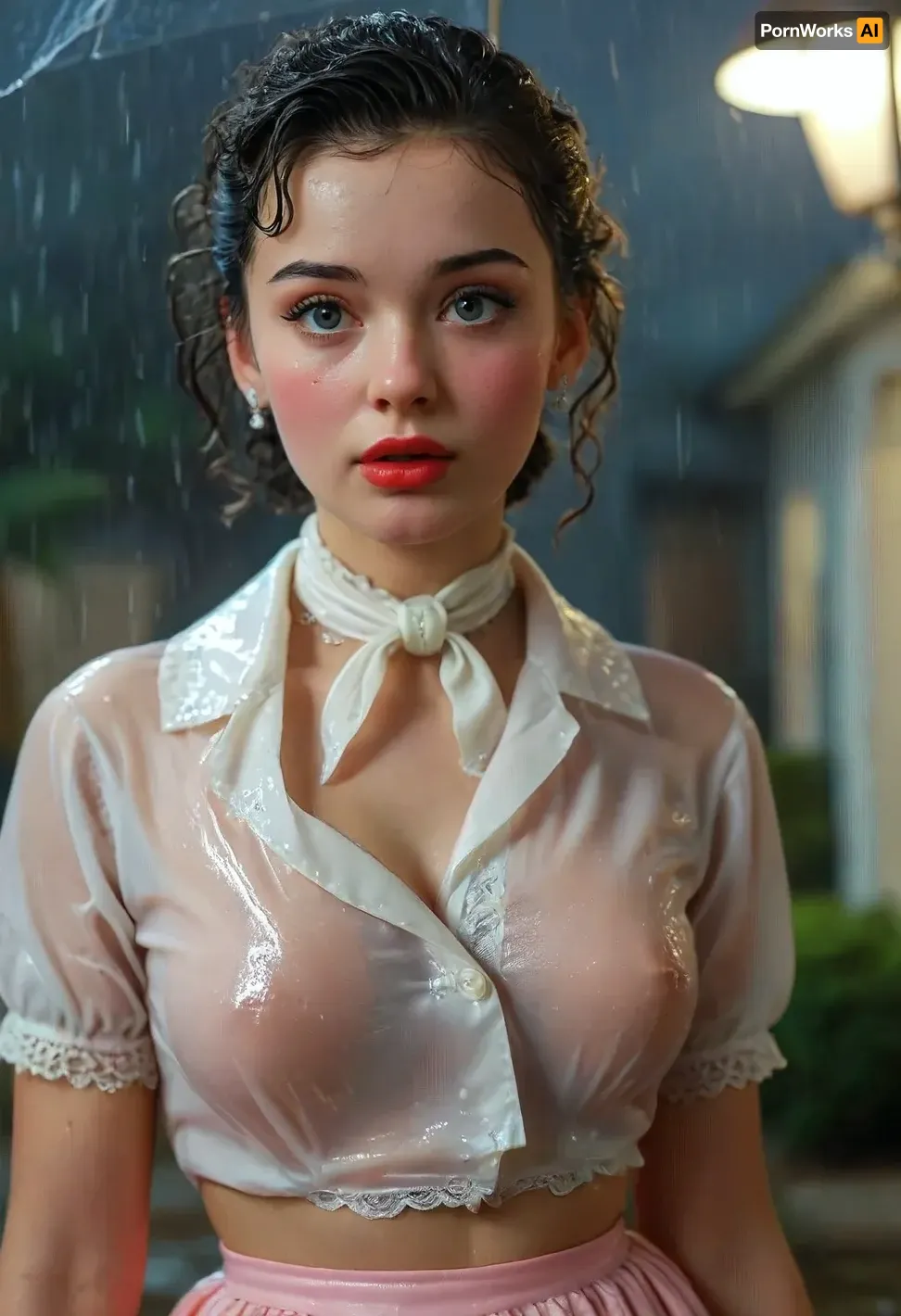 Strong 1950s retro vibe, look over the shoulder, in 1951 a breathtakingly beautiful very busty black-haired 18-year-old coed dressed for a sock hop stands outside a college gymnasium in the pouring rain, very large natural breasts, button-down shirt, neck scarf, (poodle skirt decorated with an embroidered poodle), white lace socks, saddle shoes, makeup, beautiful expressive eyes, romantic, nighttime, lots of rain in the air, retro 1950s hair and makeup and clothes and setting, masterpiece, key visual, incredibly detailed, score_9, soakingwetclothes, magazine cover, best quality, ultra-detailed, finely detail, highres, 8k wallpaper, intricate, highly detailed, insanely detailed, best lighting, perfect illumination, (best illumination), (best shadow, best shadows), full scene picture, full-length photo, ((ultra-detailed)), (intricate details:.6), professional photography, photo-realism, award winning photography, dslr, hyperrealistic, 35 mm, (Fujifilm XT3, analog style, professional DSLR photo, film grain:.8), 8k high definition, Great Composition, highly complex, (intricate detail:1.2), Ensure ultra-high-detail, photorealism, and crystal clear 32k resolution for a true masterpiece, hdri light, realistic lighting, ultra high resolution, clear focus, depth of field, 32k, 30 mm lens, 1/250 s, f/2.8, ISO 300, UHD 8K, high resolution face, perfect anatomic body, perfect waist, extremely beautiful face, <lora:soakingwetclothesXL:1.4>, <lora:MJ52:.8>, <lora:add-detail-xl:.8> Strong 1950s retro vibe, look over the shoulder, in 1951 a breathtakingly beautiful very busty black-haired 18-year-old coed dressed for a sock hop stands outside a college gymnasium in the pouring rain, very large natural breasts, button-down shirt, neck scarf, (poodle skirt decorated with an embroidered poodle), white lace socks, saddle shoes, makeup, beautiful expressive eyes, romantic, nighttime, lots of rain in the air, retro 1950s hair and makeup and clothes and setting, masterpiece, key visual, incredibly detailed, score_9, soakingwetclothes, magazine cover, best quality, ultra-detailed, finely detail, highres, 8k wallpaper, intricate, highly detailed, insanely detailed, best lighting, perfect illumination, (best illumination), (best shadow, best shadows), full scene picture, full-length photo, ((ultra-detailed)), (intricate details:.6), professional photography, photo-realism, award winning photography, dslr, hyperrealistic, 35 mm, (Fujifilm XT3, analog style, professional DSLR photo, film grain:.8), 8k high definition, Great Composition, highly complex, (intricate detail:1.2), Ensure ultra-high-detail, photorealism, and crystal clear 32k resolution for a true masterpiece, hdri light, realistic lighting, ultra high resolution, clear focus, depth of field, 32k, 30 mm lens, 1/250 s, f/2.8, ISO 300, UHD 8K, high resolution face, perfect anatomic body, perfect waist, extremely beautiful face, <lora:soakingwetclothesXL:1.4>, <lora:MJ52:.8>, <lora:add-detail-xl:.8>