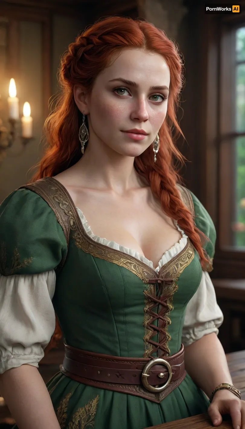 masterpiece, photorealistic, ultra realistic, 8k uhd, dslr, soft lighting, high detail, skin pores, sharp focus, cinematic, f/1.4, 85mm, A stunningly beautiful and charismatic portrait of Lohse from Divinity Original Sin 2, a slim yet athletic bard and adventurer. She has pale fair skin with freckles, and striking, expressive green eyes with a mischievous spark and a knowing glint. Her long, thick, wavy auburn hair with subtle white highlights cascades over her shoulders. She has a full figure with large breasts. She is wearing her iconic colorful bardic attire, a detailed outfit with layered fabrics of deep red, emerald green, and gold trims, leather belts with pouches and a lute strap, and ornate silver jewelry and earrings. A subtle, ethereal shadow flickers at the edges of the frame, hinting at her inner demonic possession. The background is a misty, candlelit fantasy tavern interior with wooden tables and a warm, magical glow. professional photo, unreal engine 5 render, art by greg rutkowski and artgerm