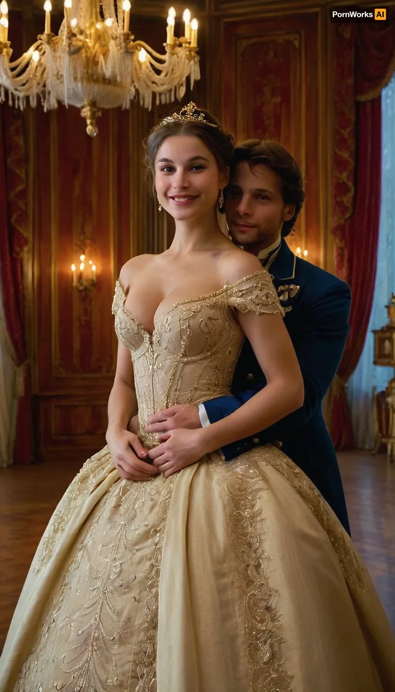 (Masterpiece, 8k, ultra realistic, high quality photography, hdr, High resolution, perfect image composition), Busty Natasha Rostova, a vibrant topless young woman with a heartwarming smile, dressed in a stunning 19th-century Russian ball gown adorned with intricate lace and shimmering crystals. Her dark hair is swept up in an elegant chignon, allowing a few soft tendrils to frame her delicate face. She stands in the grand ballroom of the Rostov estate, where opulent chandeliers cast a warm glow over the polished wooden floor and the swirling dancers. The room is a whirlwind of color and movement, with aristocrats in their finest attire mingling and laughing as the orchestra plays a lively waltz. Natasha's eyes sparkle with excitement and innocence as she twirls in the arms of her dance partner, Prince Andrei Bolkonsky, who gazes at her with admiration. In the background, the walls are adorned with rich tapestries and gold-leaf moldings, while large arched windows reveal a serene moonlit landscape of snow-covered gardens. The scene captures the essence of Natasha's youthful spirit and the enchanting allure of the high society she is about to embrace. The contrast between Natasha's youthful exuberance and the formal grandeur of the setting hints at the tumultuous journey of growth and self-discovery that lies ahead of her in the epic narrative of "War and Peace.", hairy, armpits, <lora:HAv2.0beta1:.8>