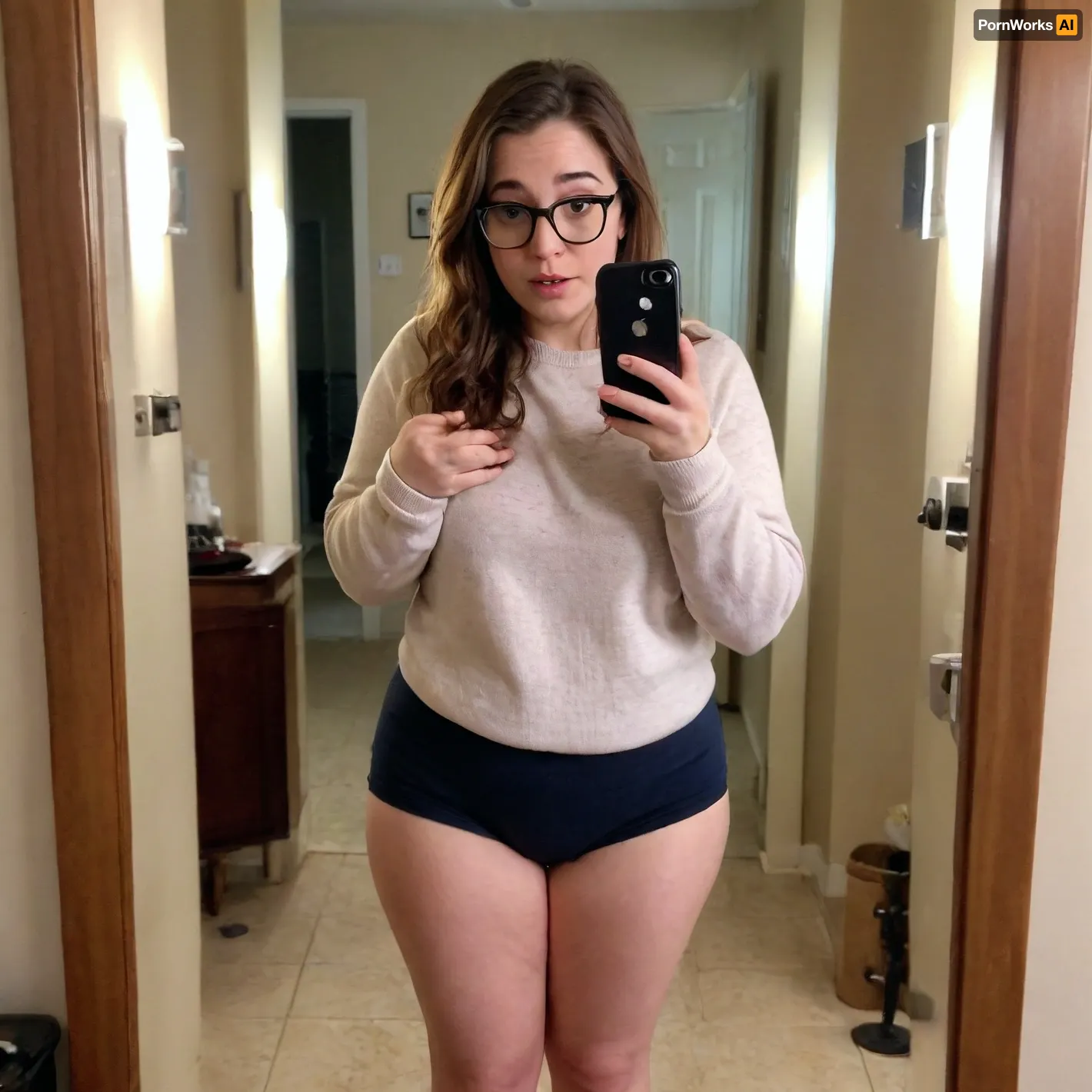 A chubby, 30 year old nerdy looking woman taking a mirror selfie with no makeup, sweaty, messy brown hair, acne, glasses, big nose, wearing a sweater. Full body photo, Bad lighting, bad angle, gross, saggy, unflattering, greasy, natural, ass, ass cheeks, thighs, bottomless iphone, mirror, selfie, holding, <lora:phone_v01:1> A chubby, 30 year old nerdy looking woman taking a mirror selfie with no makeup, sweaty, messy brown hair, acne, glasses, big nose, wearing a sweater. Full body photo, Bad lighting, bad angle, gross, saggy, unflattering, greasy, natural, ass, ass cheeks, thighs, bottomless iphone, mirror, selfie, holding, <lora:phone_v01:1>