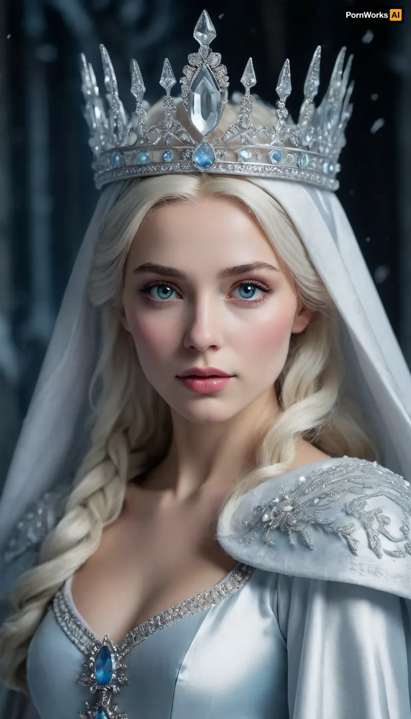 The image shows the Snow Queen, a majestic and cold heroine from the fairy tale by Hans Christian Andersen. Her image embodies icy beauty and power. The queen's face is stern, with delicate features, and her eyes radiate a cold glow, as if reflecting the light of the moon. Her headdress resembles a crown of transparent ice, with sharp edges that emphasize her royal status. The white cloak draped over her shoulders symbolizes purity and cold, and on her chest there is an ice crystal decoration that enhances her magical aura. The background of the image is dark, which emphasizes her icy glow and creates an atmosphere of mystery. This image perfectly conveys the character of the Snow Queen, a powerful but lonely ruler of the ice kingdom.