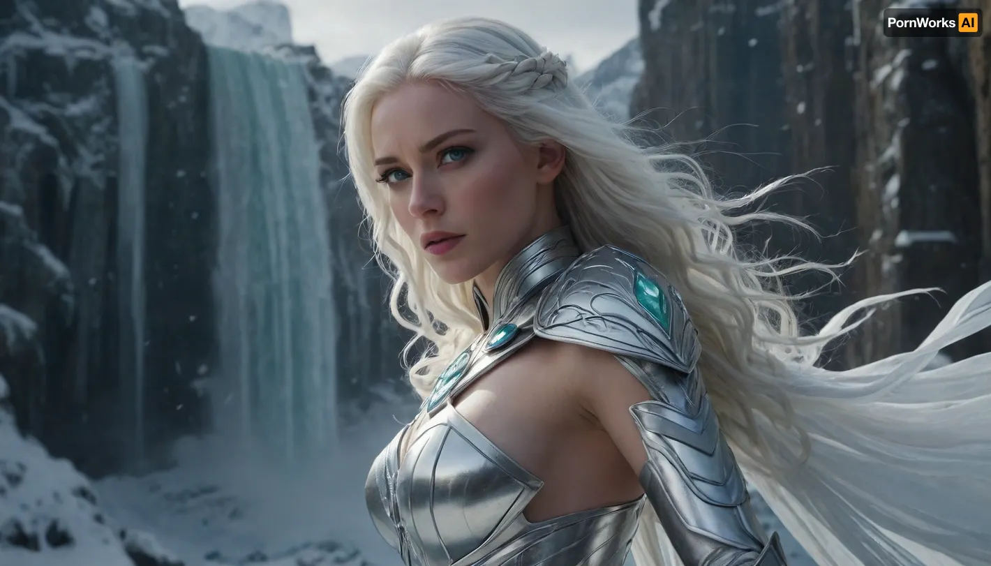 a stunning woman with piercing emerald green eyes, snow-white hair cascading down her back like a winter waterfall, clad in intricately designed, shimmering silver-white armor adorned with frosty blue accents, grasping a gleaming, crystalline ice sword that seems to radiate an intense, icy glow, standing heroically against a breathtaking backdrop of a snow-covered, mystical fantasy kingdom, with majestic, towering spires and grand, sweeping architecture, set amidst a swirling vortex of frosty winds and shimmering, ethereal mist, captured in a dynamic, cinematic camera shot that conveys a sense of power, strength, and regal authority.
