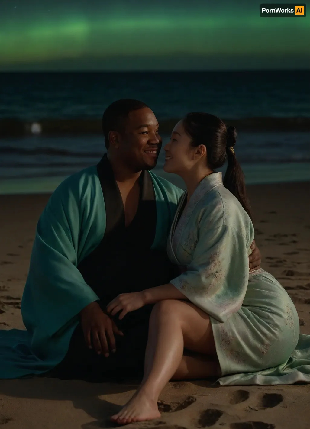 one negro fat man with tuxedo and buzz cut hair, one small cute asian woman with thick legs and huge breast and long long long straight hair wearing kimono, couple, sitting on a beach sand face to face, aurora borealis, in the middle of the screen, all eyes on viewer, all smiling, detailed face, from side