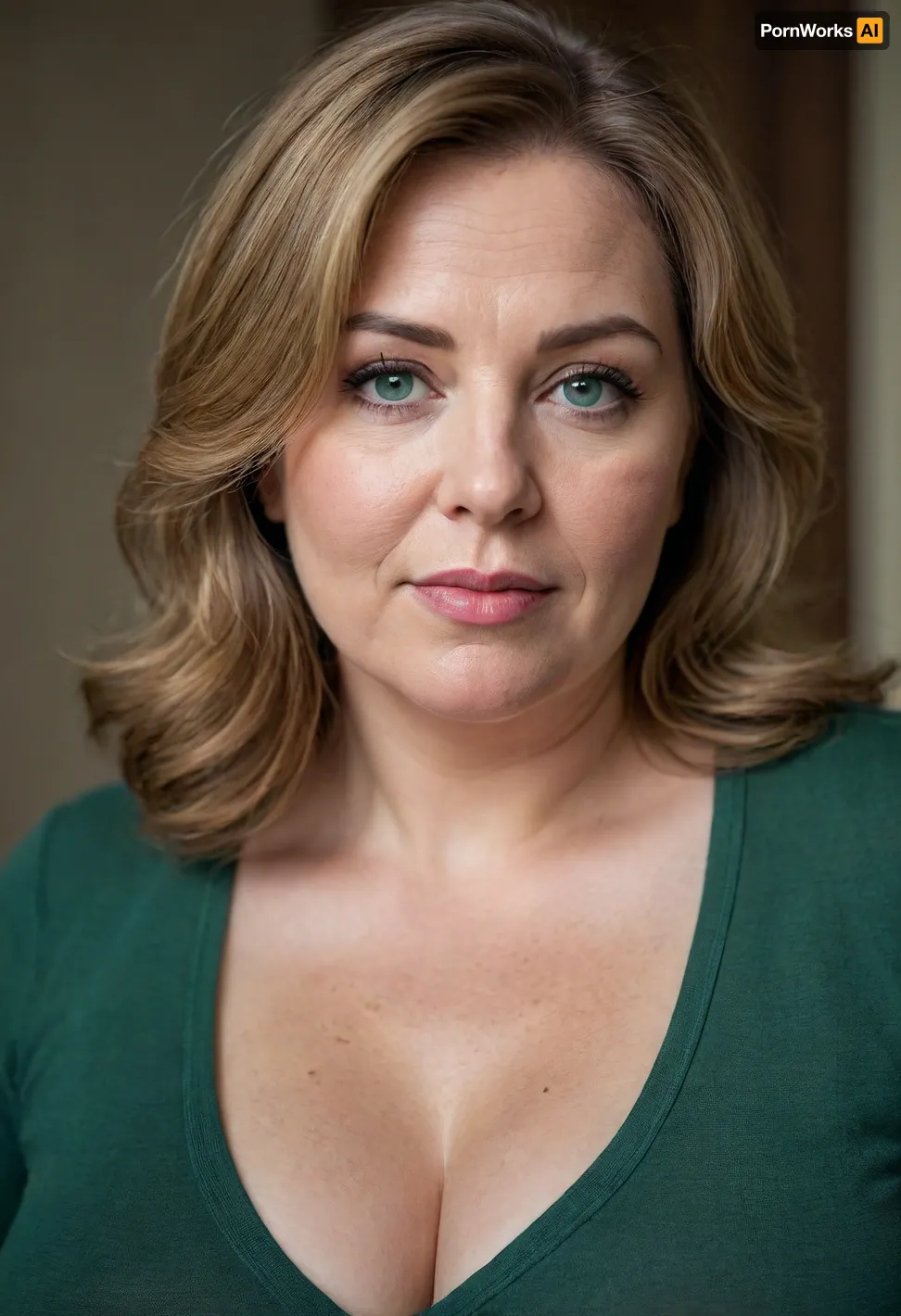 mature woman, 60s, bbw, fat, chubby, obese build, natural curves, shoulder-length light brown hair, fair warm skin, upper body portrait, deep green v-neck top with cleavage, natural bust, soft mature drop, realistic bosom shape, soft belly contour, chubby cheeks, round face, big lips, full lips, faint lines, wrinkles on face, blue-green eyes, flirtatious gaze, textured skin, photorealistic, 8k, raw photo, detailed skin texture, cinematic lighting, 85mm lens, shallow depth of field mature woman, 60s, bbw, fat, chubby, obese build, natural curves, shoulder-length light brown hair, fair warm skin, upper body portrait, deep green v-neck top with cleavage, natural bust, soft mature drop, realistic bosom shape, soft belly contour, chubby cheeks, round face, big lips, full lips, faint lines, wrinkles on face, blue-green eyes, flirtatious gaze, textured skin, photorealistic, 8k, raw photo, detailed skin texture, cinematic lighting, 85mm lens, shallow depth of field