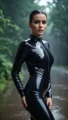 In a post-apocalyptic industrial complex, a striking sexy female survivor sits defiantly in waist-high water, her open plastic raincoat featuring a worn texture that glistens under the relentless downpour and shows her naked body underneath. The rain cascades from the night sky, creating a cinematic atmosphere as droplets splash against the coat's surface, emphasizing its ruggedness. Her coat, adorned with intricate patched repairs and buckled straps, reflects her resilience and resourcefulness. Surrounding her are the remnants of rusted machinery and crumbling concrete structures, overgrown with weeds and debris, hinting at a once-bustling environment now abandoned. Shadows dance across the scene, enhanced by the interplay of dim light filtering through the rain, casting a dramatic contrast against her silhouette. The background features blurred outlines of industrial remnants, enhancing the depth of field and drawing focus to her determined expression. The composition captures a moment of survival and strength, encapsulated in a hyperrealistic style that showcases every detail, from the droplets on her skin to the reflections in the water. Keywords, photorealism, hyperrealism, cinematic-still, street-style portrait, post-apocalyptic, night scene, rain, industrial complex, waist-high water, resilience, resourcefulness, light and shadow interplay, detailed textures, dramatic contrast, depth of field, emotional intensity.
