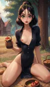 reiq style and Jack cayless art style, 25 yo woman, skinny, large saged breasts, flat chest, black updo haircut, tall, thick thights, long legs, thin waist, green eyes, red lips, (wearing white ukrainian embroidered unbuttoned shirt, black dress, deep neckline, exposed breasts, one breast out, one breast visible), (no panties), (chamomile and viburnum wreath), sitting on haystack on wheat field, clay jug with milk, wicker basket with pies and apples, view from side, spreading legs to the viewer, golden hour sunlight filters through nearby trees, creating dramatic shadows and highlighting her fair skin, looking to viewer, ratatatat74, <lora:EnvyBeautyXL02:1>, <lora:mk_Bp Anime_xl:1>, <lora:EnvyAnimeDigitalPaintingXL01:1>, <lora:ratatatat74-000050:1.9>