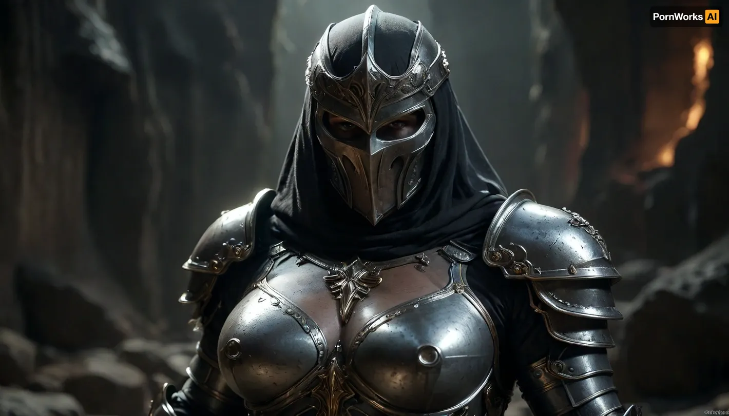 Uber realistic, 8k, ultra detailed, ((massive ass:1.4)), ((massive breasts:1.4)), masterpiece, mature fantasy paladin warrior, (holy shining silver armor), holding polearm in right hand, underground cave, (full_helmet:1.3), closed_helmet, visor, (face covered:1.5), night, realistic detailed eyes, realistic detailed armor, realistic detailed body, realistic detailed skin, hkstyle, detailxl, <lora:add-detail-xl:1.5>, <lora:style_lora_realis:1>, <lora:dark:.8>, <lora:hkstyleV5:1>