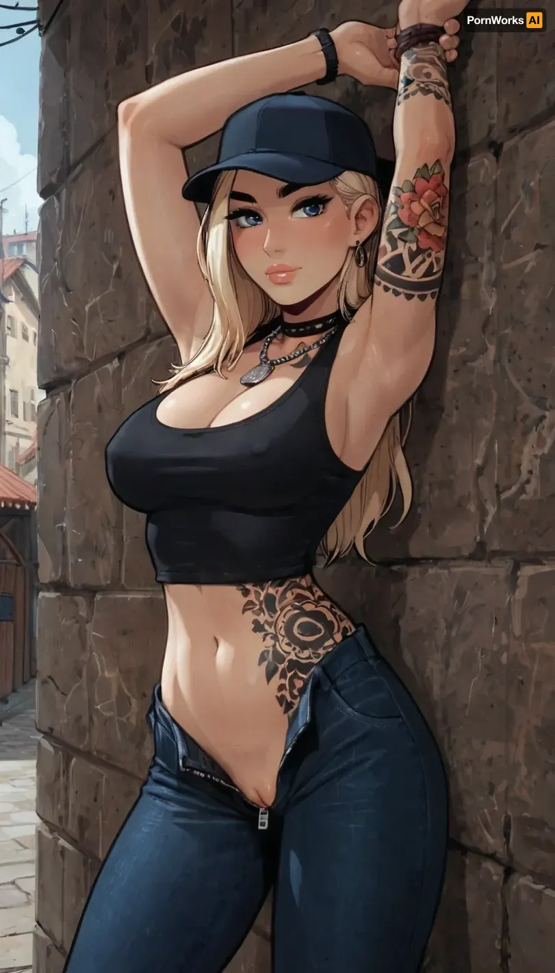 8k, score_9, score_8_up, score_7_up, Reiq feat Incase feat innv feat melkor mancin style, 25+, slender, Rounded Breast, Very blonde Hair, Tattoo, Cosplay, black backwards cap, dark blue eyes, looking at viewer, firm perky large breasts, tight svelte waist, slender figure, artistic tattoos, dragon tattoos, geometric tattoos, tribal tattoos, floral tattoos, totem tattoos, tattoos on arms, tattoos on forearms, tattoos on chest and stomach, american traditional style tattoos, dogtag neck chain, wrist watch, (black tanktop), (breasts fully covered by black Tanktop), (((blue Hot Pants))), unzipped pants, open fly, shaved pussy, no panties, posing in American alley, stretching, citylora, <lora:City_SDXL_v1:.8>, ratatatat74, cute, doodle, <lora:ratatatat74-000050:.8>, <lora:cutedoodle_XL-000012:.8>, <lora:NEOTOKIOXL_0.2_RC:.8>, <lora:outline_xl_kohaku_delta_spv5x:.8>