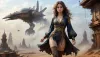 The image features a beautiful mid-aged woman . She has an oval face, thin lips and expressive eyes. Her eyes are light brown. Her skin is fair. Straight nose. A small vertical groove on the tip of the nose. Almost perfect figure, a little plump. Small natural breasts. Soft bteasts, low placed breasts. Short waist. Hairstyle, She has extremely long cuirl, messy hair, with the bangs, dark brown in color. Her hair is styled in a casual hairstyle, probably in waves or curlsShe is flying on the mechanical bird. The backdrop showcases a futuristic cityscape against the desolate landscape of Tatooine, adding an air of mythical grandeur.