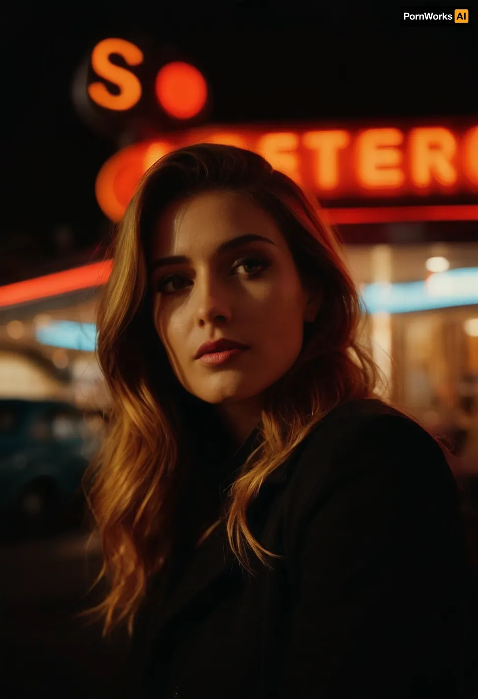 (avant-garde snapshot aesthetic, deep saturation, shadowy vignetting, light leaks, film grain, bokeh:1.4), adoring wife, outside neon retro diner, perfecteyes, <lora:PerfectEyesXL:.4>, sunnyrayyxo, <lora:sunnyrayyxo_v1_SDXLBase:.4>