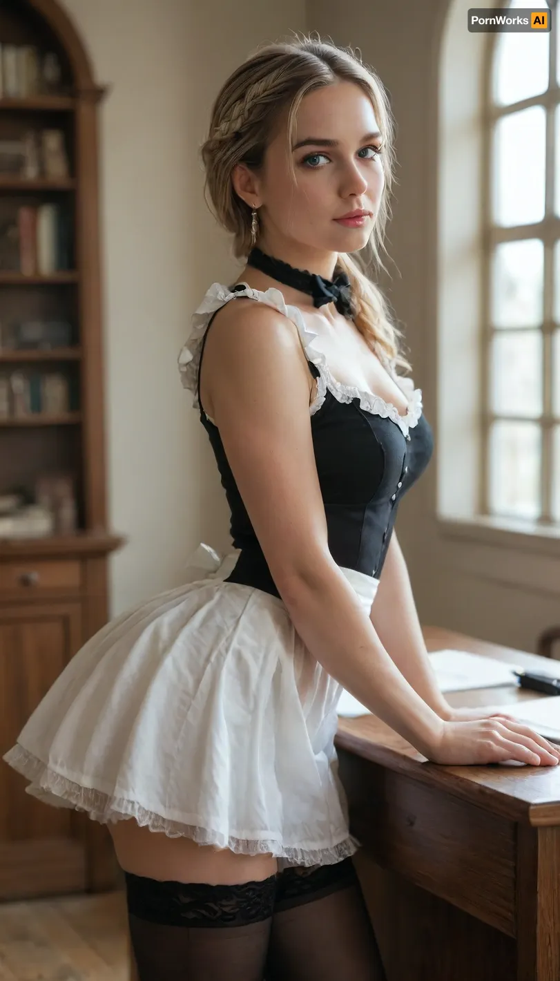 high definition, ultra realistic, masterpiece, (18 years old), (realistic skin texture), ((confident expression)), (extremely beautiful face, perfect body:1.4), seductive woman, soft curled blonde hair, light blue eyes, gothic maid dress, low-cut, thigh-highs, sexy, arching back, (side view), bent over desk, soft warm indoor light, blurred cozy boudoir high definition, ultra realistic, masterpiece, (18 years old), (realistic skin texture), ((confident expression)), (extremely beautiful face, perfect body:1.4), seductive woman, soft curled blonde hair, light blue eyes, gothic maid dress, low-cut, thigh-highs, sexy, arching back, (side view), bent over desk, soft warm indoor light, blurred cozy boudoir