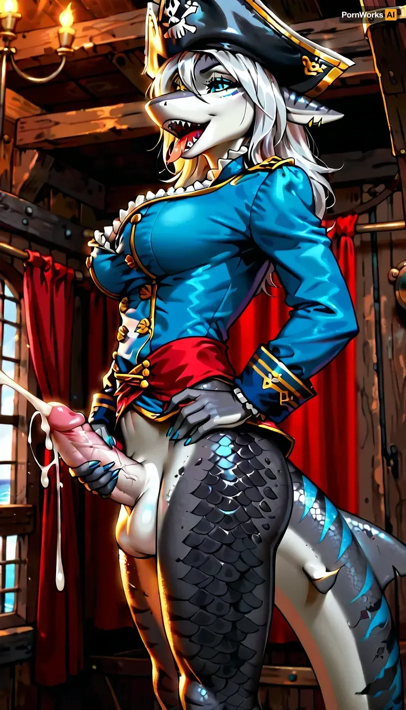 Side view, bottom view, in pirate ship, standing style, dungeon and dragons, dlss, RTX, masturbating solo, silver hair, ((anthro shark, futanari anthro female shark, captain pirate uniform, black scales, bright blue neon tiger stripes)), futa hold by the camera, Mouth open, tongue out, cum, orgasm, huge cum load, <lora:189654_training_data:.8>, <lora:early621-000002:1.2> Side view, bottom view, in pirate ship, standing style, dungeon and dragons, dlss, RTX, masturbating solo, silver hair, ((anthro shark, futanari anthro female shark, captain pirate uniform, black scales, bright blue neon tiger stripes)), futa hold by the camera, Mouth open, tongue out, cum, orgasm, huge cum load, <lora:189654_training_data:.8>, <lora:early621-000002:1.2>