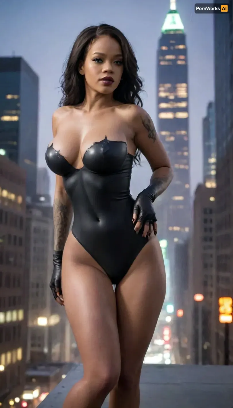 ((((Full frame view of woman show feet, full body visible from toes to head, focus on feet)))), (((100% matching Rihanna face))), toes, open toe high heels, (((Full length professional photography, Full body view of A mesmerizing female 60 years old Venom symbiote with huge boobs and round ass show toes and stunning tattooed long legs))), sculpted with the elegance and allure of a modern-day Aphrodite. Her body is a masterful blend of alien and human, her skin a sleek and shimmering black, adorned with the signature white web-like patterns that dance across her voluptuous curves. Her waist is dramatically thin, accentuating her wide hips and full huge sagging breasts that defy gravity in a tantalizing display of power. Her face is a seductive amalgamation of human and symbiote features, with piercing white eyes and a sinister smile that reveals a massive tongue, unfurled and quivering with anticipation. The tongue extends outwards, a grotesquely fascinating spectacle, reaching almost to her chin, hinting at the creature's insatiable hunger. Her posture is a study in confidence and seduction, one hand resting on her hip while the other is raised, fingers curled as if beckoning the viewer closer. The background is a haze of shadow and neon lights, reminiscent of a bustling city at night, suggesting a world where she is both predator and temptress. Her stance, with one leg bent and her hips pushed out, showcases her form in a pose that is both sexually charged and ready for battle. The symbiote's tendrils sway gently around her, creating an aura of both beauty and menace. She stands on the edge of a skyscraper, the city sprawling below her, as if the world is her playground and she is poised to claim it. The overall effect is a captivating mix of horror and desire, a creature of the night that commands attention and leaves the viewer both intrigued and unsettled., sharp focus, depth of field, 8k photo, HDR, professional lighting, taken with Canon EOS R5, 75mm lens, natural beauty, torn, fly, down, at, _______, round, Symbiote, Suit, <lora:tornclothesv6-8:.7>, <lora:chest_adjust:.7>, <lora:round_breasts-XL-1.0:.6>, <lora:Symbiote Suit:1.2>, <lora:Platform_mules-000009:1.1>