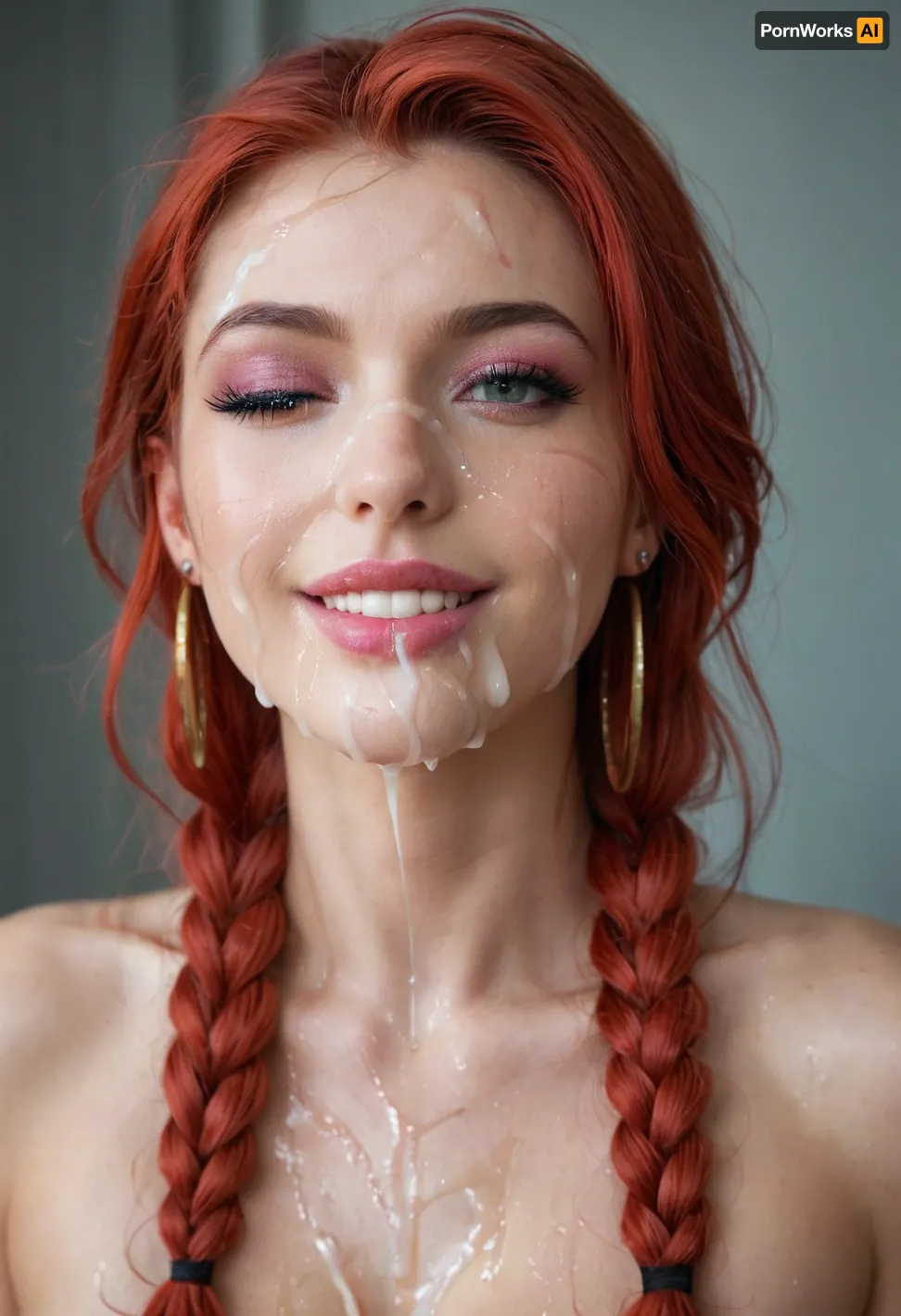 「AI-generated」のイメージでは、若い女性、双頭編みで髪の毛をふんだんにし、1つの肩にゆるやかな編みこいカスケードが現れ、ソロを立つ。 輝きのある赤髪は、笑顔で顔の光を浴び、一眼は縮みに閉じます。 このモデルは、顔にcumの芸術的なアプリケーションによって提案され、美しく描かれています。 目の周りの微妙な陰影は、イメージの深さと現実性を与えます。 この興味深いシーンは、女性が官能的な、エロチックな経験、ブッカケのシーンで驚異的な感情を伝えているようです.