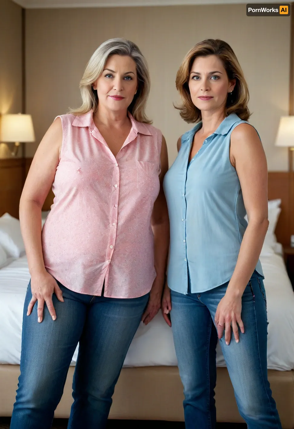 Two women, xxl size Two 65 year old fat saggy cellulite women wearing sleeveless cotton blouse and jeans in modern hotel room, looking at viewer, fully dressed, depth of field Two women, xxl size Two 65 year old fat saggy cellulite women wearing sleeveless cotton blouse and jeans in modern hotel room, looking at viewer, fully dressed, depth of field