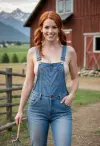 Female farm worker, (fit), red hair, pigtails, ((big breasts)), denim overalls, (naked overalls), (no shirt), (no bra), straw cowboy hat, holding pitchfork, bright colors, pastel tones, farm scene with wooden barn, mountains in background, slightly exaggerated features, soft lighting, action pose, smiling kindly at viewer. Female farm worker, (fit), red hair, pigtails, ((big breasts)), denim overalls, (naked overalls), (no shirt), (no bra), straw cowboy hat, holding pitchfork, bright colors, pastel tones, farm scene with wooden barn, mountains in background, slightly exaggerated features, soft lighting, action pose, smiling kindly at viewer.