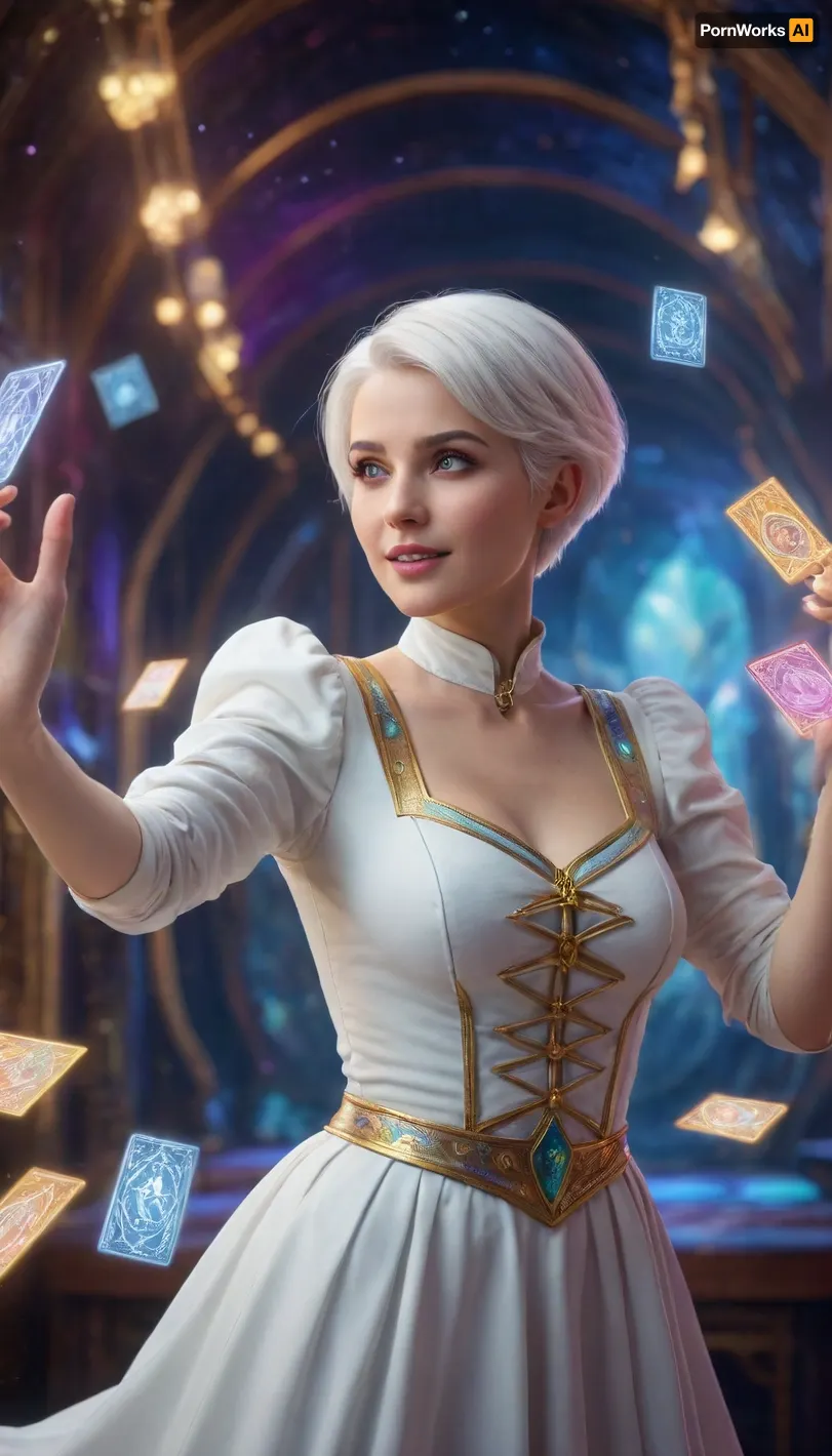 3D high-definition 8k image quality. 4k special effects, a lively and cheerful charming woman with short white hair, alchemist costume, arms open with neon multi-color glimmering tarot cards, (special effects polymerization reaction light), super gorgeous flying, the overall ethereal fantasy space. 3D Rendering 3D high-definition 8k image quality. 4k special effects, a lively and cheerful charming woman with short white hair, alchemist costume, arms open with neon multi-color glimmering tarot cards, (special effects polymerization reaction light), super gorgeous flying, the overall ethereal fantasy space. 3D Rendering