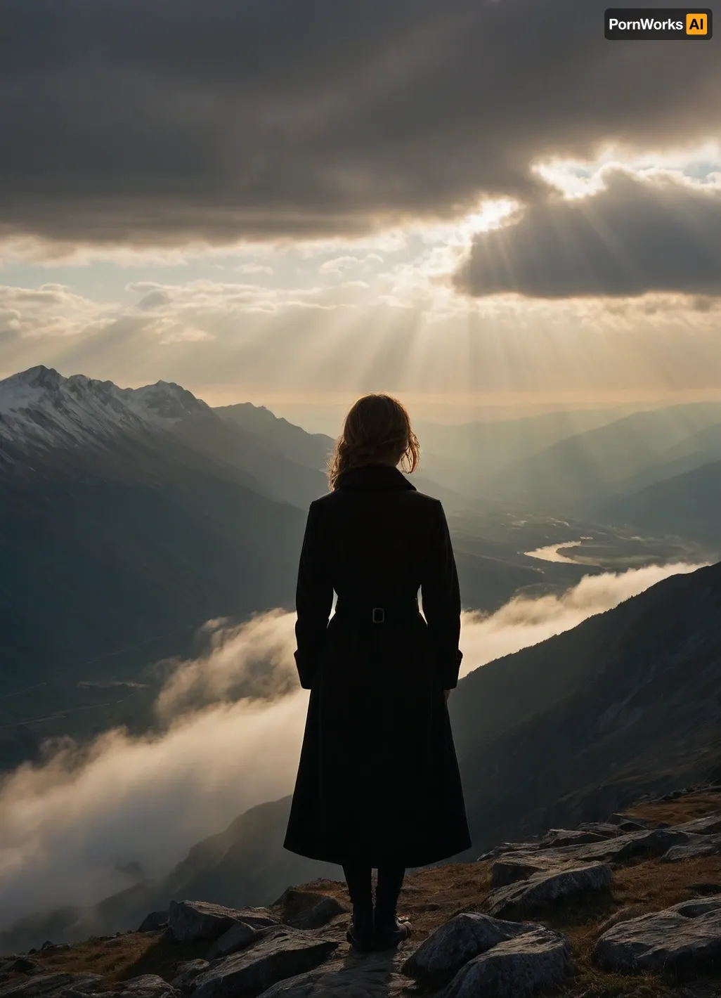 woman in a dark coat, standing on the edge of a mountain range, we see her from behind, thick clouds around, light haze, sunbeams breaking through the clouds, romance and dream, picturesque realism