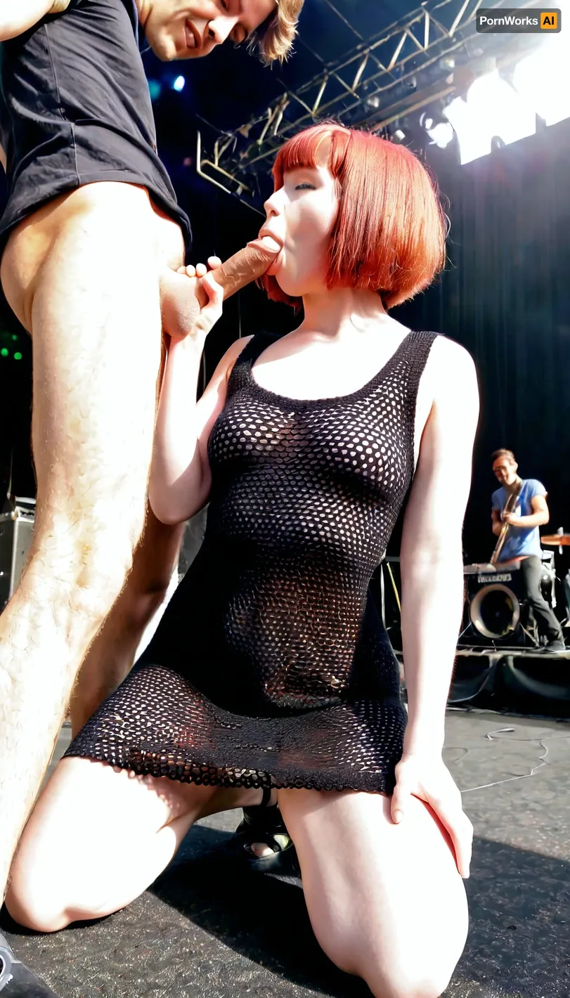 Sexy redhaired groupie, (bobcut), wearing a black coarsely crocheted summer dress, kneeling, shaking her head, caresses her pussy and sucks the cock of the singer on stage during a sunny concert Penetration, deep fuck, huge cock