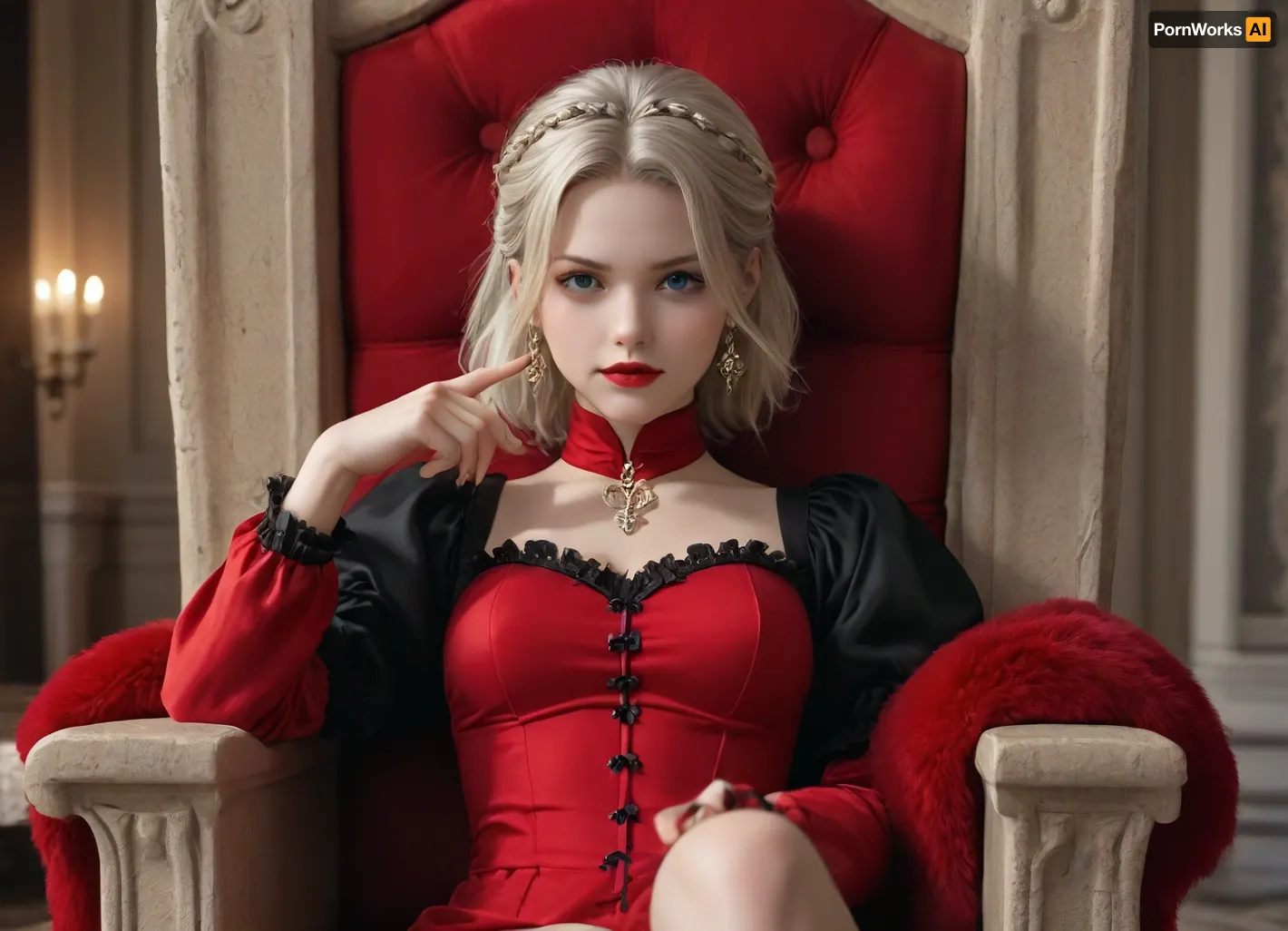 (Mistress Aethany's Throne Room), Luxurious, dimly lit chamber with crimson walls adorned with golden accents and lavish tapestries depicting scenes of dominance and submission. A grand, ornate throne sits atop a dais, surrounded by plush velvet cushions in deep purple hues. The air is thick with the scent of incense, adding to the sensual ambiance., (Mistress Aethany's Posture), Leaning back slightly in her throne, mistress cradles your face in her hands, thumbs stroking your cheekbones as she gazes down at you with an intense, possessive look. Her full, crimson lips curve into a satisfied smirk, revealing a hint of fang. (Mistress Aethany's Throne Room), Luxurious, dimly lit chamber with crimson walls adorned with golden accents and lavish tapestries depicting scenes of dominance and submission. A grand, ornate throne sits atop a dais, surrounded by plush velvet cushions in deep purple hues. The air is thick with the scent of incense, adding to the sensual ambiance., (Mistress Aethany's Posture), Leaning back slightly in her throne, mistress cradles your face in her hands, thumbs stroking your cheekbones as she gazes down at you with an intense, possessive look. Her full, crimson lips curve into a satisfied smirk, revealing a hint of fang.