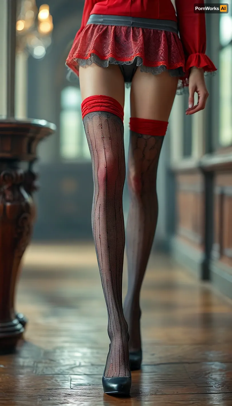(Pantyhose thigh high gray lace fishnet pattern with, (red top trim))