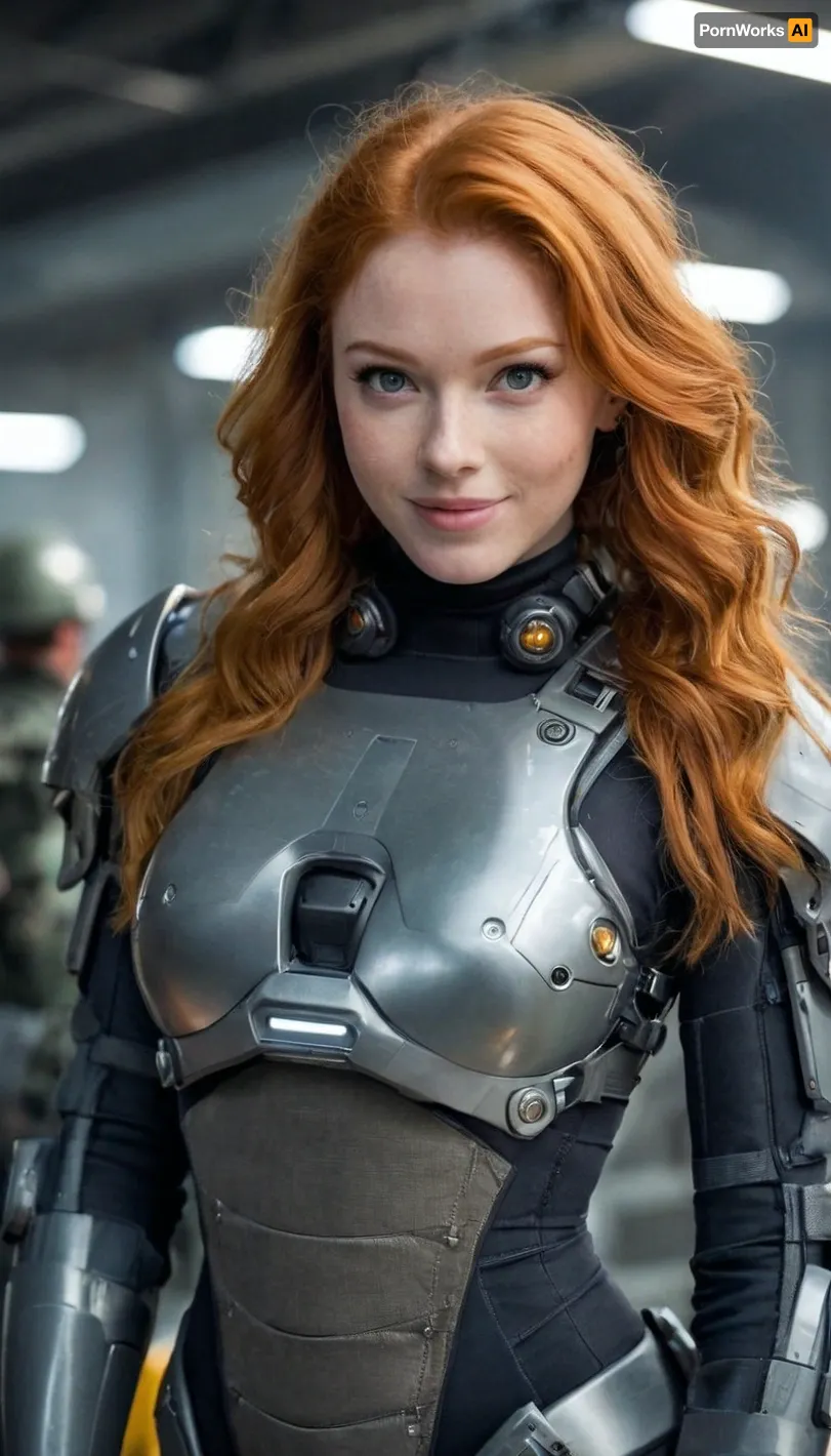 Candid photo, ultimate realism, futuristic ginger 22 year old super soldier, flirty smile, high tech exosuit, realistic detailed eyes, Futureistic fortress Hanger, realistic detailed face, realistic detailed skin, mildly busty, gunmetal Grey, heavy equipment Candid photo, ultimate realism, futuristic ginger 22 year old super soldier, flirty smile, high tech exosuit, realistic detailed eyes, Futureistic fortress Hanger, realistic detailed face, realistic detailed skin, mildly busty, gunmetal Grey, heavy equipment