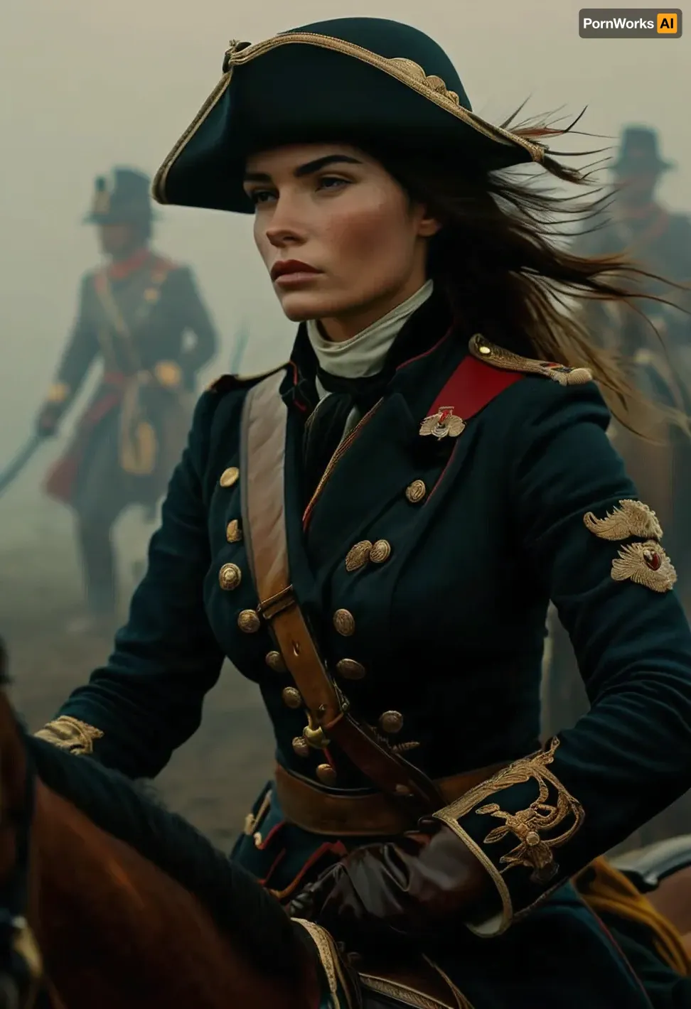 Uber realistic, 8k, ultra detailed, masterpiece, Beautiful 1920s female cavalry soldier, mounted riding across a battlefield, (heavy fog:1.5), cleavage, detailed face, detailed hair, detailed body, detailed skin, detailed breasts, High, Resolution, More, Details, 8K, but, <lora:MJ52:.8>, <lora:add-detail-xl:.8>, <lora:BUT_SDXL_SHS:.3>