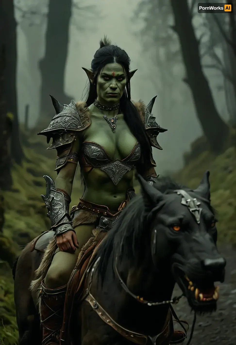 Uber realistic, 8k, ultra detailed, masterpiece, Beautiful female fantasy orc, (green skin), mounted riding a large wolf, along a dark forest path, (heavy fog:1.5), armor, detailed face, detailed hair, detailed body, detailed skin, detailed breasts, High, Resolution, More, Details, 8K, but, <lora:MJ52:.8>, <lora:add-detail-xl:.8>, <lora:BUT_SDXL_SHS:.3>