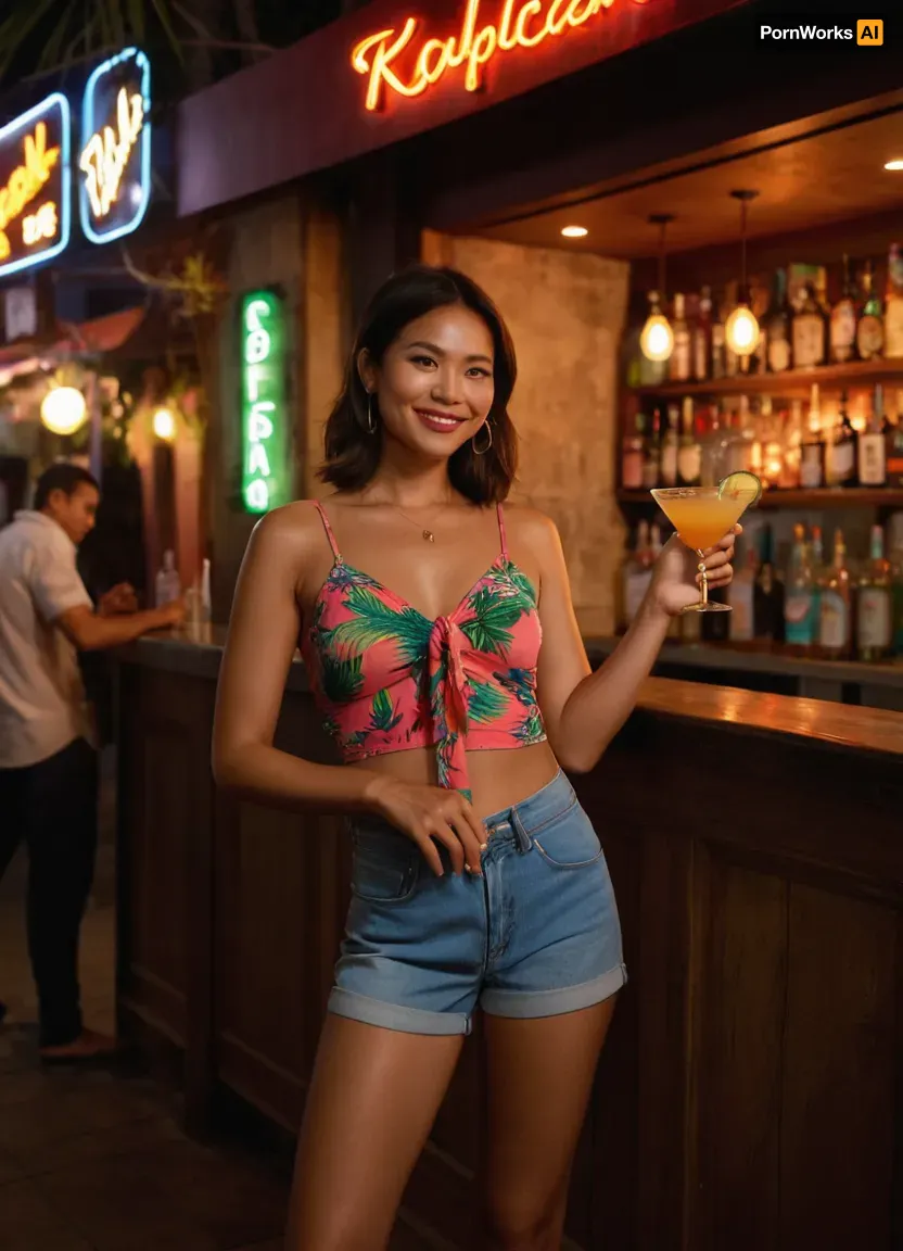 "A vibrant scene outside a lively bar in Thailand, where a woman stands in the doorway, energetically promoting drinks and encouraging customers to enter. She’s dressed in a colorful, casual outfit, perhaps a tropical-patterned top and denim shorts, with a friendly, welcoming smile. The warm evening lights of the bar glow behind her, casting a soft, inviting atmosphere. The street is bustling with people and neon signs, and palm trees gently sway in the tropical breeze. Her posture is enthusiastic, holding a cocktail in one hand and gesturing toward the bar with the other, as she beckons potential customers to join the fun."