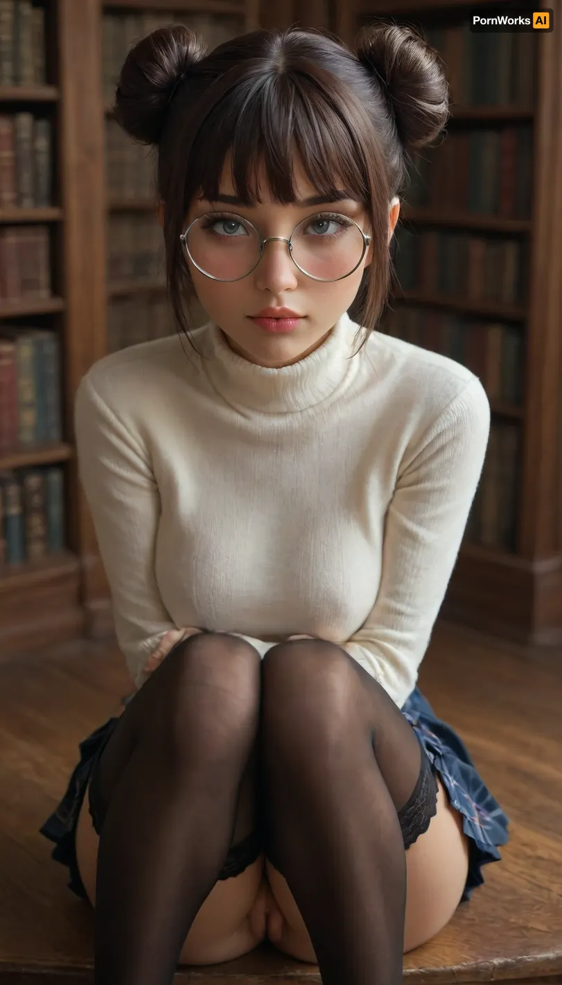 BREAK, (busty:.2), (curvy:.2), (tanned:.2), youthful complexion, (freckles:.2), (buns and bangs:2), (fully clothed:1.7), (round glasses:1.7), (turtleneck:1.5), (skirt:1.8), (stockings:1.7), (sitting with knees together:2), (library:1.6), athletic, tight body, slim neck, narrow chest and shoulders, small chest, narrow waist, (wide hips:1.1), muscular thighs, perfect shapely ass, (natural perfect shapely perky breasts:1.1), (tidy godpussy:1.8), (most beautiful girl:1.2), <lora:Natali:2>, <lora:Perfect_Eyes:2>, <lora:WildcardX-XL-Detail-Enhancer:2> Kiriko, (looking at viewer like lewd girl yearning for intense hard fuck:2), (incredibly horny and ready to be fucked:2), (perfect lustful lips:1.2), (sultry eyes:1.2), (most beautiful sexy face:1.2), (sexy eyes:1.4), dark long eyelashes, (sexually suggestive on set of erotic photoshoot because she wants to have sex with viewer:1.6), (perfect adult body proportions:1.8), (inviting sexual perfection:1.4), (stunningly beautiful:1.2), (very horny slut:1.2), (her sexual pose accentuating sexual perfection of her body:1.6), .