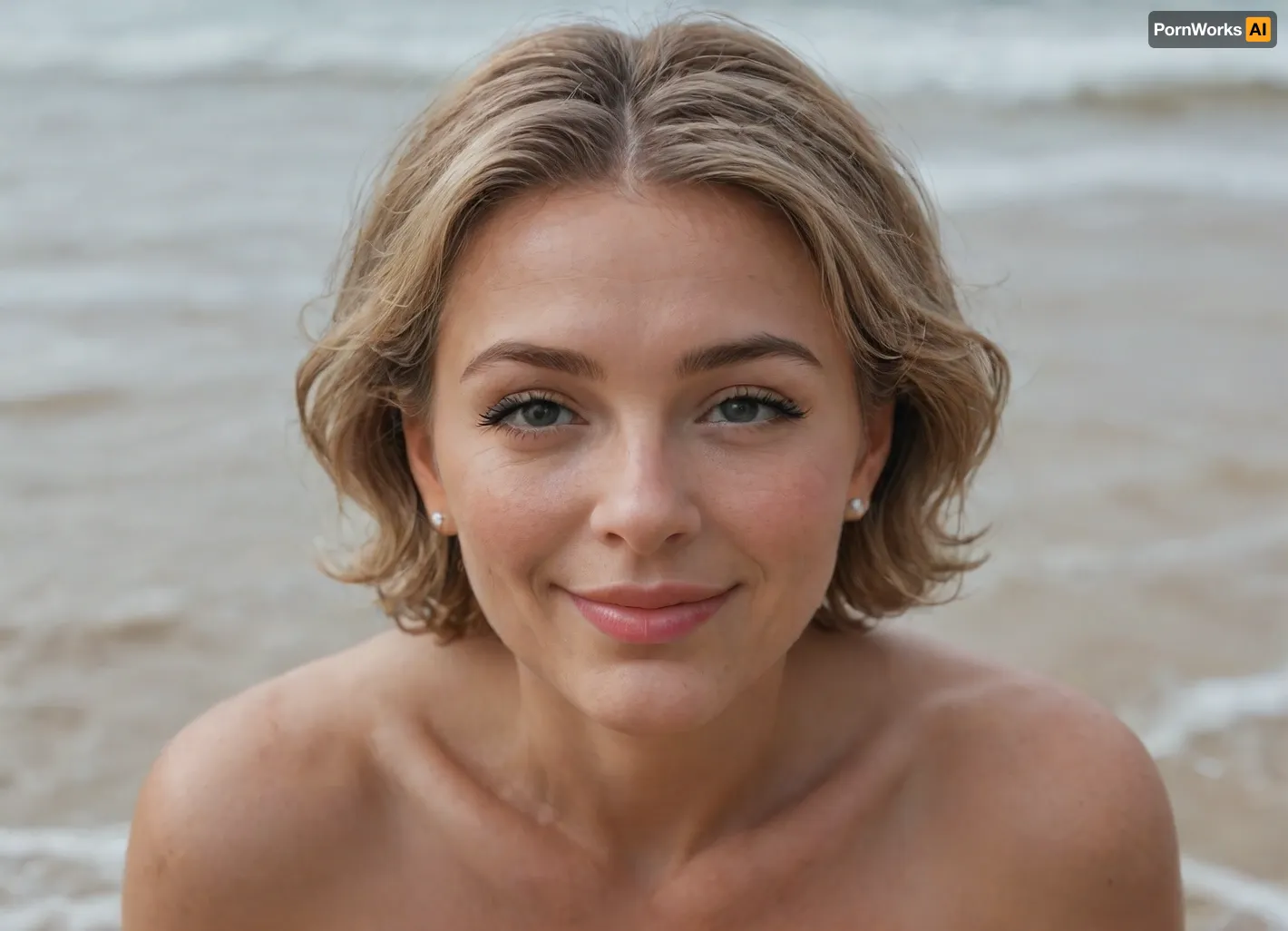 small boobs, (small soaking wet sexy boobs), squatting, full view, view from afar, 157 cm height, on a beach, shot on kodak, sharp focus, high budget, cinemascope, moody, epic, gorgeous, film grain, grainy, dark gray eyes, short blonde hair, pixie cut, 39 year old woman, mature, milf, happy expression, (smile:1.6), long eyelashes, curly nose, (wide nose:1.7), (thin lips:1.5), breasts fully exposed, <lora:flat_chested_v3.5:.8>