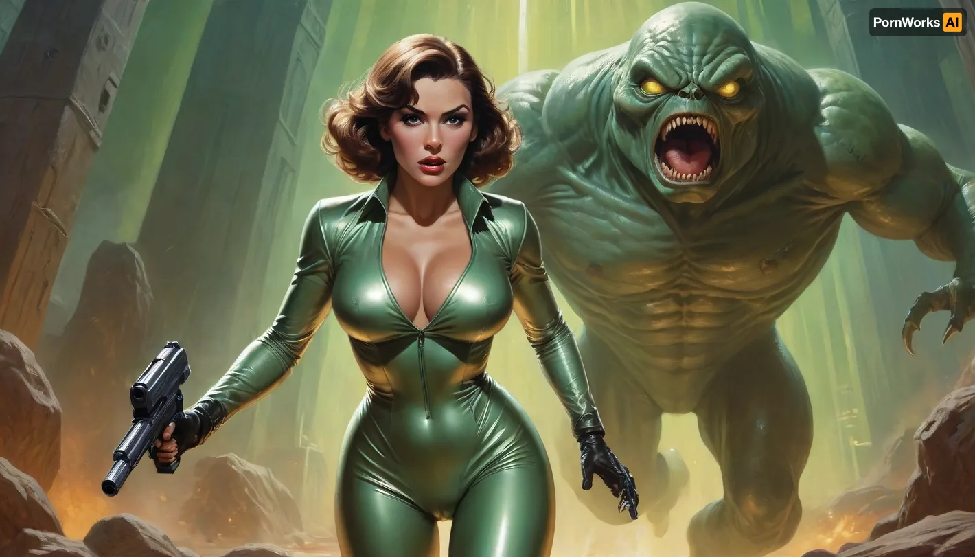 Richard Hescox style, full portrait view of a tempting and beautiful futuristic space maiden with huge breasts wearing a shiny suit and holding a rifle pistol with a horrified and shocked look on her face, she is running away from a giant glowing creature with a bulbous fluid eye, against the background of a dark and dank alien dungeon, by Adam Hughes, by Bill Ward, wide angle, super high angle, top view, bird's eye view, backglow, dynamic lighting, wet, greasy, green backlit, <lora:Richard Hescox Style:1>