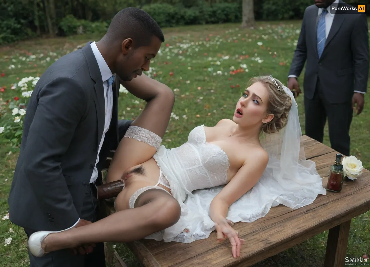 wonderful most beautiful wedding bride, detailed face, full lips, blonde hair, hairbun, conservative white wedding dress, garter belt and sheer brown stockings, Louboutin conservative high heels, dress lift up, decent red lips in face, hourglass figure, ripped stockings, wedding flowers, wedding bouquet, huge wedding cake, bottles champagner, surprised, wide open mouth, hands holding her boobs, (interracial sex:1.3), fucked by an aggressive stranger homeless large black man, missionary, (3rd person), sex, sitting on a table, rough fucking sex, legs spread wide, dark hairy pussy, rough sex, deep penetration, black man in suit, black man gritting teeth, black man has aggressive look, cum dripping down thighs, hard fucking, outdoors, flowering meadow, wedding guests watching, many people around, late afternoon, long deep shadows, specular lighting, creampie, impregnation, full body view wonderful most beautiful wedding bride, detailed face, full lips, blonde hair, hairbun, conservative white wedding dress, garter belt and sheer brown stockings, Louboutin conservative high heels, dress lift up, decent red lips in face, hourglass figure, ripped stockings, wedding flowers, wedding bouquet, huge wedding cake, bottles champagner, surprised, wide open mouth, hands holding her boobs, (interracial sex:1.3), fucked by an aggressive stranger homeless large black man, missionary, (3rd person), sex, sitting on a table, rough fucking sex, legs spread wide, dark hairy pussy, rough sex, deep penetration, black man in suit, black man gritting teeth, black man has aggressive look, cum dripping down thighs, hard fucking, outdoors, flowering meadow, wedding guests watching, many people around, late afternoon, long deep shadows, specular lighting, creampie, impregnation, full body view
