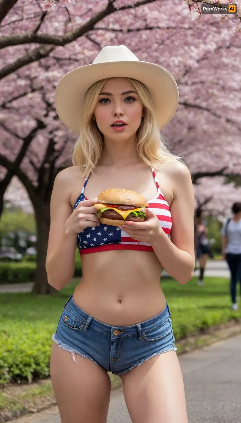 A beautiful white American girl, blonde hair, cowboy hat, American flag Bikini, Jeans mini shorts, ((eating a cheeseburger)), ((confused face)), ((baffled)), ((confused)), ((lost)), ((dumb)), ((stupid)), in the O-Hanami Cherry Blossom and Cherry Festival, full body, Japan-ish, <lora:401657_training_data:2>, Hasui, Kawase, Style, page, <lora:Hasui Kawase Style:.8>