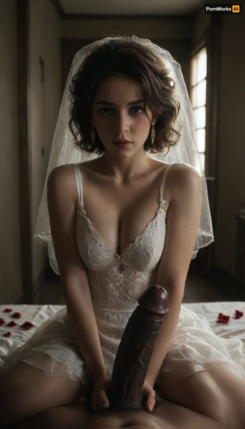 AI는 문턱에 서 간장 검은 남자의 이미지를 생성, 그의 큰 검은 펜을 보유. 안쪽에, slutty와 cutout 결혼식 복장에 있는 아름다운 백색 신부는 호화스러운 침대에 앉습니다. 오쟁이 진 남편은, 또한 한 벌에, 온화하게 hugs 그녀의, 둘 다 서로 사랑. 방에 부드러운 양초와 달빛은, 장미 꽃잎이 주위에 흩어져, 꿈과 친밀한 분위기를 만드는. 이 장면은 매우 상세한 낭만적인 침실 순간을 가진 환상 작풍, 몇 쌍 사이 감성적인 노예를 강화하는 영화 점화입니다.