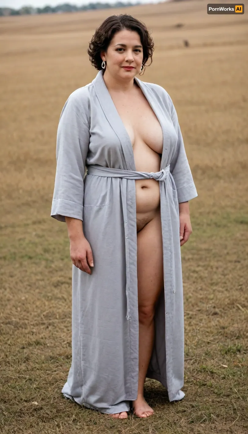 A full-length photo. A plump 65-year-old mature woman with chubby legs poses in a very short housecoat with no clothes under the robe, standing in a field A full-length photo. A plump 65-year-old mature woman with chubby legs poses in a very short housecoat with no clothes under the robe, standing in a field